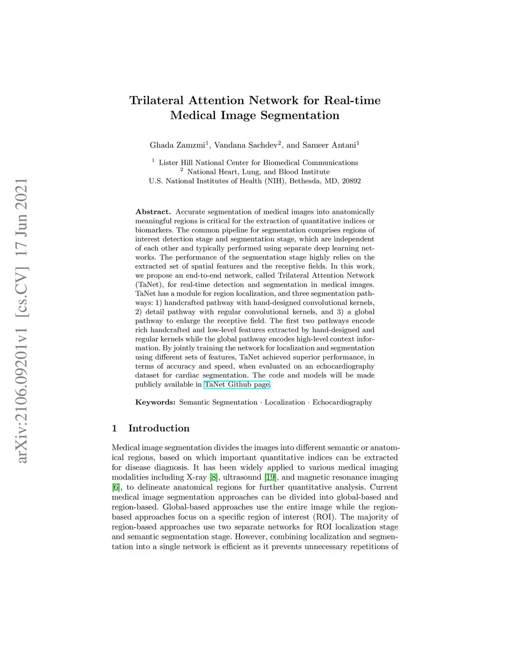Accurate segmentation of medical images into anatomically meaningful regions is critical for the extraction of quantitative indices or biomarkers. The common pipeline for segmentation comprises regions of interest detection stage and segmentation stage, which are independent of each other and typically performed using separate deep learning networks. The performance of the segmentation stage highly relies on the extracted set of spatial features and the receptive fields. In this work, we propose an end-to-end network, called Trilateral Attention Network (TaNet), for real-time detection and segmentation in medical images. TaNet has a module for region localization, and three segmentation pathways: 1) handcrafted pathway with hand-designed convolutional kernels, 2) detail pathway with regular convolutional kernels, and 3) a global pathway to enlarge the receptive field. The first two pathways encode rich handcrafted and low-level features extracted by hand-designed and regular kernels while the global pathway encodes high-level context information. By jointly training the network for localization and segmentation using different sets of features, TaNet achieved superior performance, in terms of accuracy and speed, when evaluated on an echocardiography dataset for cardiac segmentation. The code and models will be made publicly available in TaNet Github page.