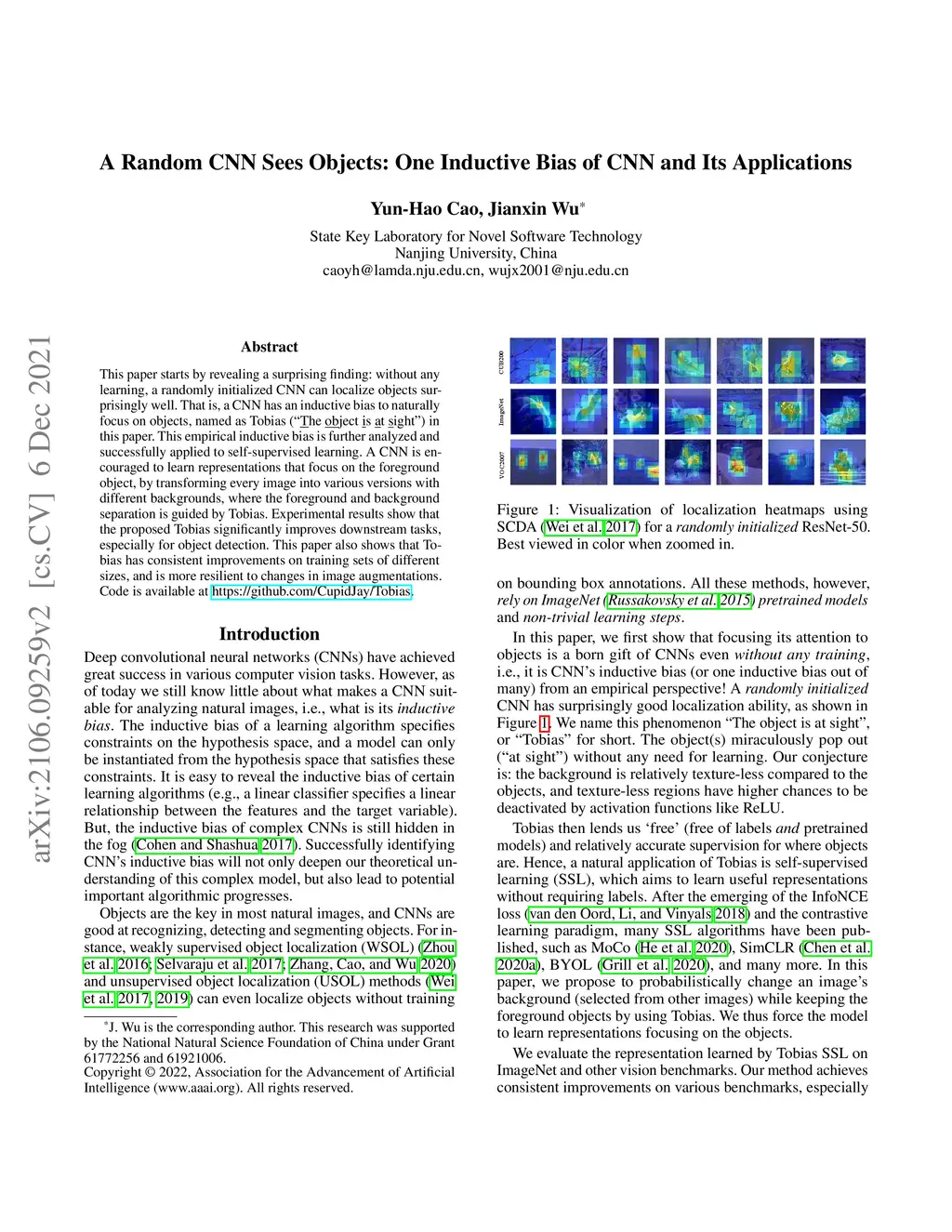 This paper starts by revealing a surprising finding: without any learning, a randomly initialized CNN can localize objects surprisingly well. That is, a CNN has an inductive bias to naturally focus on objects, named as Tobias ("The object is at sight") in this paper. This empirical inductive bias is further analyzed and successfully applied to self-supervised learning (SSL). A CNN is encouraged to learn representations that focus on the foreground object, by transforming every image into various versions with different backgrounds, where the foreground and background separation is guided by Tobias. Experimental results show that the proposed Tobias significantly improves downstream tasks, especially for object detection. This paper also shows that Tobias has consistent improvements on training sets of different sizes, and is more resilient to changes in image augmentations. Code is available at https://github.com/CupidJay/Tobias.