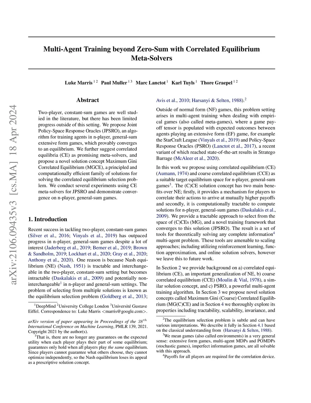 Two-player, constant-sum games are well studied in the literature, but there has been limited progress outside of this setting. We propose Joint Policy-Space Response Oracles (JPSRO), an algorithm for training agents in n-player, general-sum extensive form games, which provably converges to an equilibrium. We further suggest correlated equilibria (CE) as promising meta-solvers, and propose a novel solution concept Maximum Gini Correlated Equilibrium (MGCE), a principled and computationally efficient family of solutions for solving the correlated equilibrium selection problem. We conduct several experiments using CE meta-solvers for JPSRO and demonstrate convergence on n-player, general-sum games.