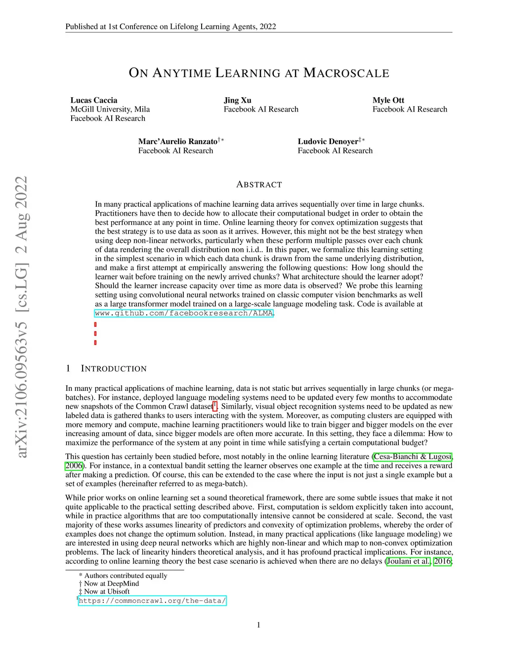In many practical applications of machine learning data arrives sequentially over time in large chunks. Practitioners have then to decide how to allocate their computational budget in order to obtain the best performance at any point in time. Online learning theory for convex optimization suggests that the best strategy is to use data as soon as it arrives. However, this might not be the best strategy when using deep non-linear networks, particularly when these perform multiple passes over each chunk of data rendering the overall distribution non i.i.d.. In this paper, we formalize this learning setting in the simplest scenario in which each data chunk is drawn from the same underlying distribution, and make a first attempt at empirically answering the following questions: How long should the learner wait before training on the newly arrived chunks? What architecture should the learner adopt? Should the learner increase capacity over time as more data is observed? We probe this learning setting using convolutional neural networks trained on classic computer vision benchmarks as well as a large transformer model trained on a large-scale language modeling task. Code is available at \url{www.github.com/facebookresearch/ALMA}.