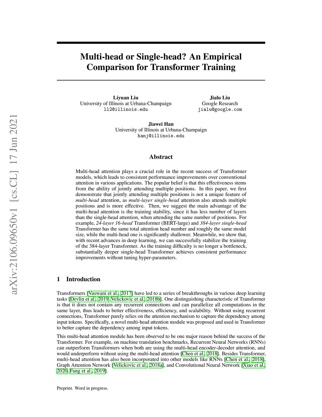 Multi-head attention plays a crucial role in the recent success of Transformer models, which leads to consistent performance improvements over conventional attention in various applications. The popular belief is that this effectiveness stems from the ability of jointly attending multiple positions. In this paper, we first demonstrate that jointly attending multiple positions is not a unique feature of multi-head attention, as multi-layer single-head attention also attends multiple positions and is more effective. Then, we suggest the main advantage of the multi-head attention is the training stability, since it has less number of layers than the single-head attention, when attending the same number of positions. For example, 24-layer 16-head Transformer (BERT-large) and 384-layer single-head Transformer has the same total attention head number and roughly the same model size, while the multi-head one is significantly shallower. Meanwhile, we show that, with recent advances in deep learning, we can successfully stabilize the training of the 384-layer Transformer. As the training difficulty is no longer a bottleneck, substantially deeper single-head Transformer achieves consistent performance improvements without tuning hyper-parameters.