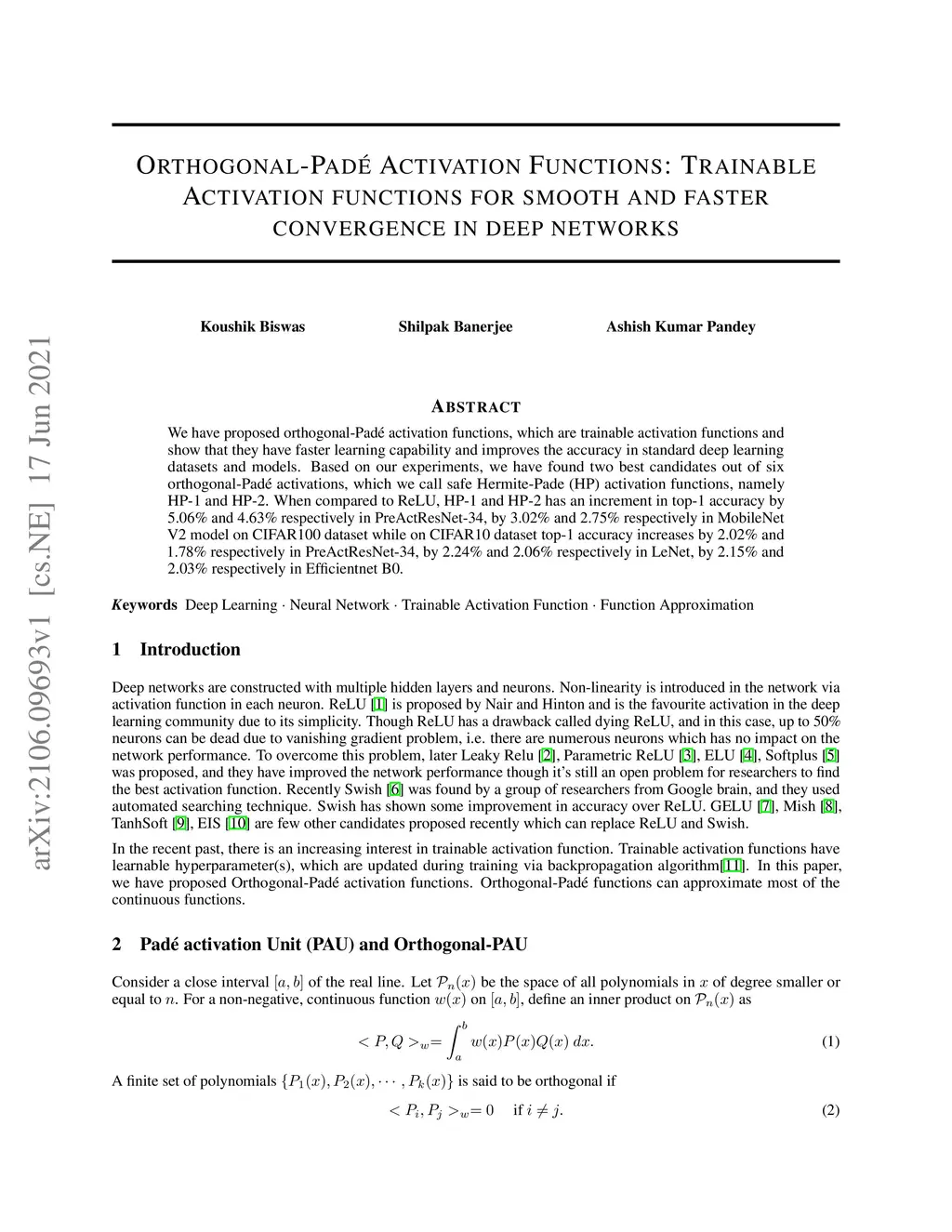 We have proposed orthogonal-Pad\é activation functions, which are trainable activation functions and show that they have faster learning capability and improves the accuracy in standard deep learning datasets and models. Based on our experiments, we have found two best candidates out of six orthogonal-Pad\é activations, which we call safe Hermite-Pade (HP) activation functions, namely HP-1 and HP-2. When compared to ReLU, HP-1 and HP-2 has an increment in top-1 accuracy by 5.06% and 4.63% respectively in PreActResNet-34, by 3.02% and 2.75% respectively in MobileNet V2 model on CIFAR100 dataset while on CIFAR10 dataset top-1 accuracy increases by 2.02% and 1.78% respectively in PreActResNet-34, by 2.24% and 2.06% respectively in LeNet, by 2.15% and 2.03% respectively in Efficientnet B0.