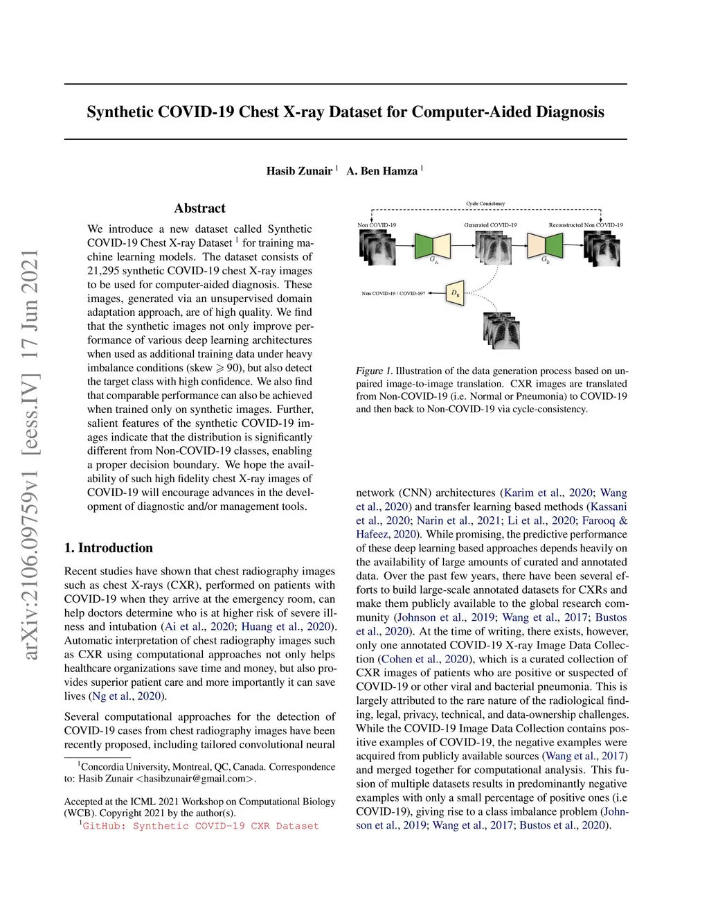 We introduce a new dataset called Synthetic COVID-19 Chest X-ray Dataset for training machine learning models. The dataset consists of 21,295 synthetic COVID-19 chest X-ray images to be used for computer-aided diagnosis. These images, generated via an unsupervised domain adaptation approach, are of high quality. We find that the synthetic images not only improve performance of various deep learning architectures when used as additional training data under heavy imbalance conditions, but also detect the target class with high confidence. We also find that comparable performance can also be achieved when trained only on synthetic images. Further, salient features of the synthetic COVID-19 images indicate that the distribution is significantly different from Non-COVID-19 classes, enabling a proper decision boundary. We hope the availability of such high fidelity chest X-ray images of COVID-19 will encourage advances in the development of diagnostic and/or management tools.