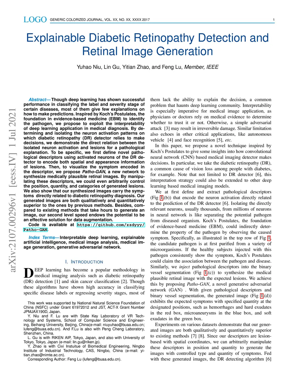 Though deep learning has shown successful performance in classifying the label and severity stage of certain diseases, most of them give few explanations on how to make predictions. Inspired by Koch's Postulates, the foundation in evidence-based medicine (EBM) to identify the pathogen, we propose to exploit the interpretability of deep learning application in medical diagnosis. By determining and isolating the neuron activation patterns on which diabetic retinopathy (DR) detector relies to make decisions, we demonstrate the direct relation between the isolated neuron activation and lesions for a pathological explanation. To be specific, we first define novel pathological descriptors using activated neurons of the DR detector to encode both spatial and appearance information of lesions. Then, to visualize the symptom encoded in the descriptor, we propose Patho-GAN, a new network to synthesize medically plausible retinal images. By manipulating these descriptors, we could even arbitrarily control the position, quantity, and categories of generated lesions. We also show that our synthesized images carry the symptoms directly related to diabetic retinopathy diagnosis. Our generated images are both qualitatively and quantitatively superior to the ones by previous methods. Besides, compared to existing methods that take hours to generate an image, our second level speed endows the potential to be an effective solution for data augmentation.