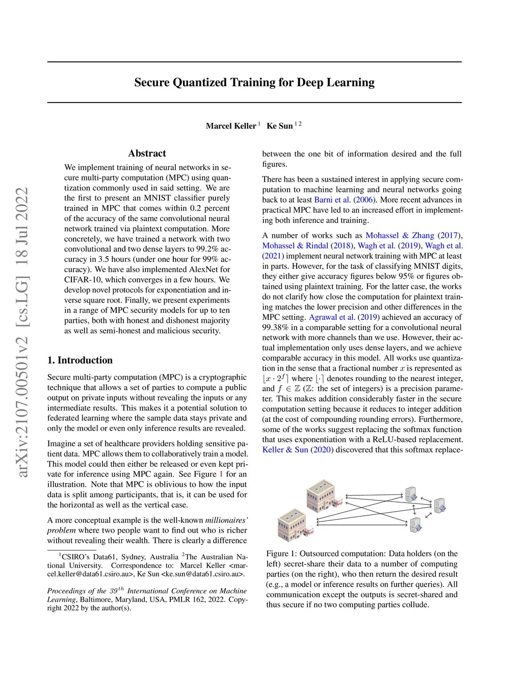 We implement training of neural networks in secure multi-party computation (MPC) using quantization commonly used in said setting. We are the first to present an MNIST classifier purely trained in MPC that comes within 0.2 percent of the accuracy of the same convolutional neural network trained via plaintext computation. More concretely, we have trained a network with two convolutional and two dense layers to 99.2% accuracy in 3.5 hours (under one hour for 99% accuracy). We have also implemented AlexNet for CIFAR-10, which converges in a few hours. We develop novel protocols for exponentiation and inverse square root. Finally, we present experiments in a range of MPC security models for up to ten parties, both with honest and dishonest majority as well as semi-honest and malicious security.