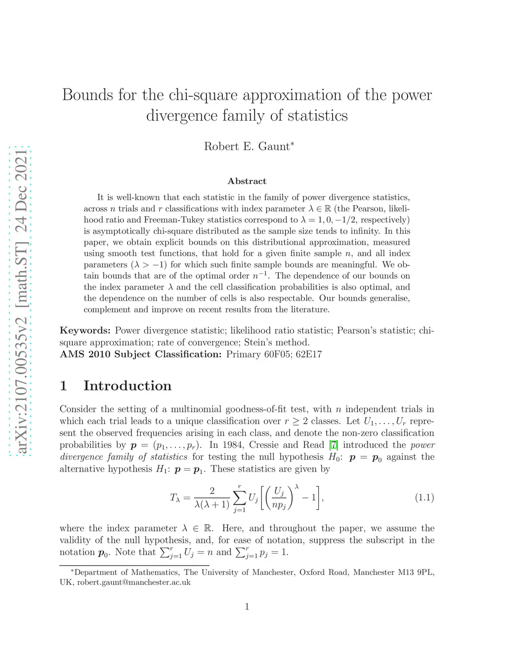 It is well-known that each statistic in the family of power divergence statistics, across trials and classifications with index parameter (the Pearson, likelihood ratio and Freeman-Tukey statistics correspond to , respectively) is asymptotically chi-square distributed as the sample size tends to infinity. In this paper, we obtain explicit bounds on this distributional approximation, measured using smooth test functions, that hold for a given finite sample , and all index parameters () for which such finite sample bounds are meaningful. We obtain bounds that are of the optimal order . The dependence of our bounds on the index parameter and the cell classification probabilities is also optimal, and the dependence on the number of cells is also respectable. Our bounds generalise, complement and improve on recent results from the literature.