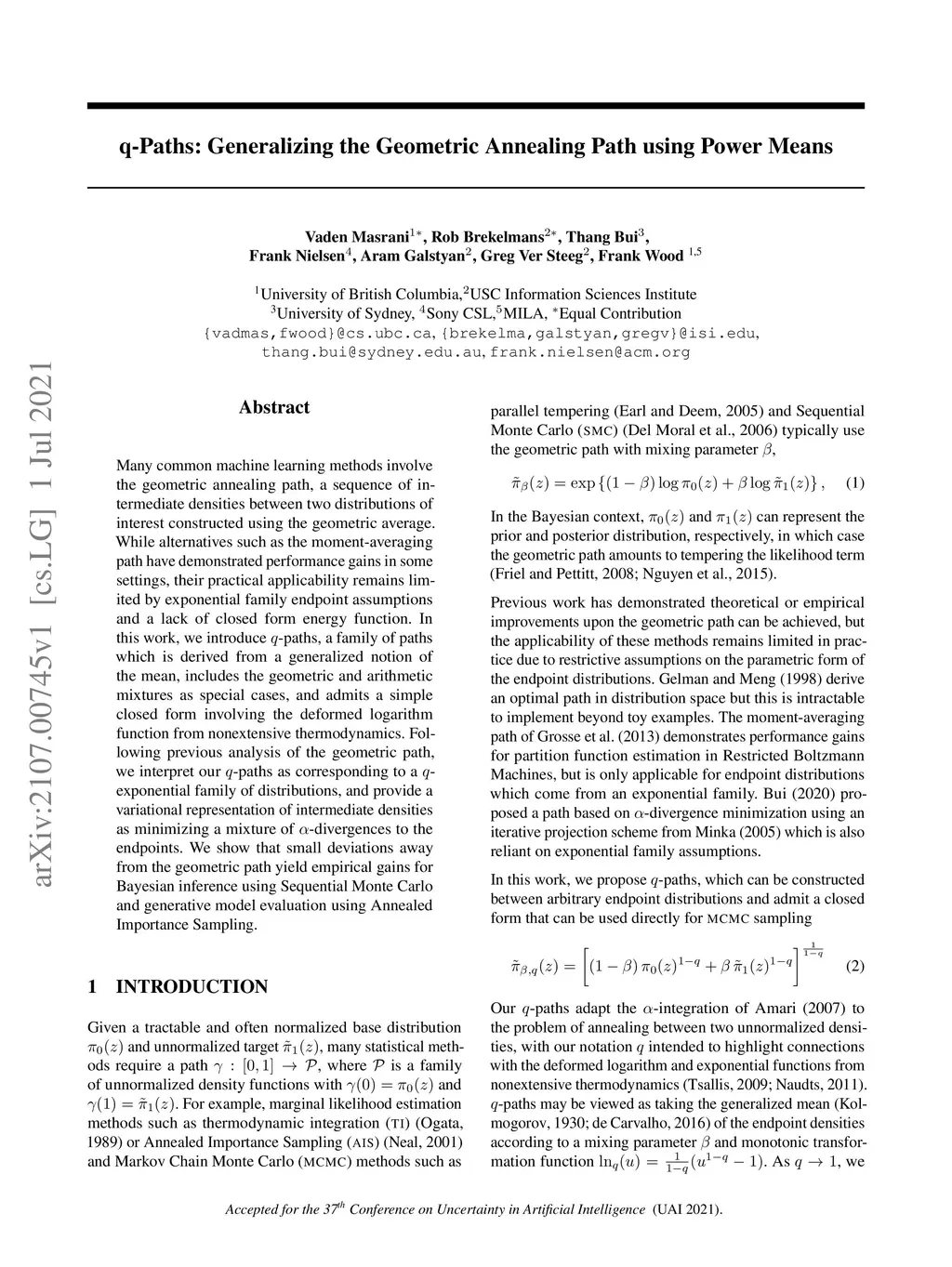 Many common machine learning methods involve the geometric annealing path, a sequence of intermediate densities between two distributions of interest constructed using the geometric average. While alternatives such as the moment-averaging path have demonstrated performance gains in some settings, their practical applicability remains limited by exponential family endpoint assumptions and a lack of closed form energy function. In this work, we introduce -paths, a family of paths which is derived from a generalized notion of the mean, includes the geometric and arithmetic mixtures as special cases, and admits a simple closed form involving the deformed logarithm function from nonextensive thermodynamics. Following previous analysis of the geometric path, we interpret our -paths as corresponding to a -exponential family of distributions, and provide a variational representation of intermediate densities as minimizing a mixture of -divergences to the endpoints. We show that small deviations away from the geometric path yield empirical gains for Bayesian inference using Sequential Monte Carlo and generative model evaluation using Annealed Importance Sampling.