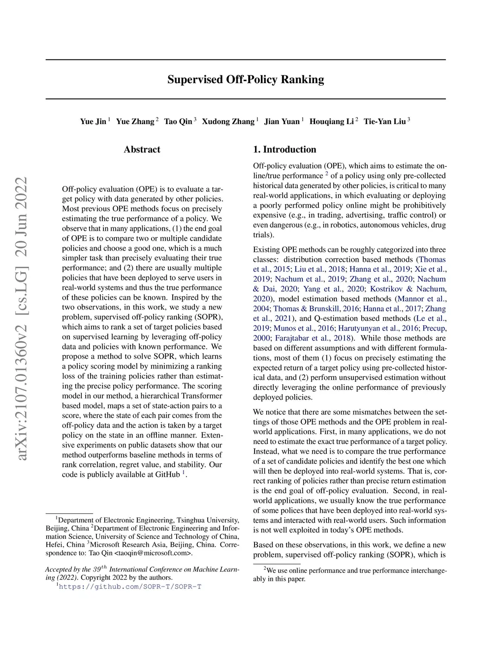Off-policy evaluation (OPE) is to evaluate a target policy with data generated by other policies. Most previous OPE methods focus on precisely estimating the true performance of a policy. We observe that in many applications, (1) the end goal of OPE is to compare two or multiple candidate policies and choose a good one, which is a much simpler task than precisely evaluating their true performance; and (2) there are usually multiple policies that have been deployed to serve users in real-world systems and thus the true performance of these policies can be known. Inspired by the two observations, in this work, we study a new problem, supervised off-policy ranking (SOPR), which aims to rank a set of target policies based on supervised learning by leveraging off-policy data and policies with known performance. We propose a method to solve SOPR, which learns a policy scoring model by minimizing a ranking loss of the training policies rather than estimating the precise policy performance. The scoring model in our method, a hierarchical Transformer based model, maps a set of state-action pairs to a score, where the state of each pair comes from the off-policy data and the action is taken by a target policy on the state in an offline manner. Extensive experiments on public datasets show that our method outperforms baseline methods in terms of rank correlation, regret value, and stability. Our code is publicly available at GitHub.