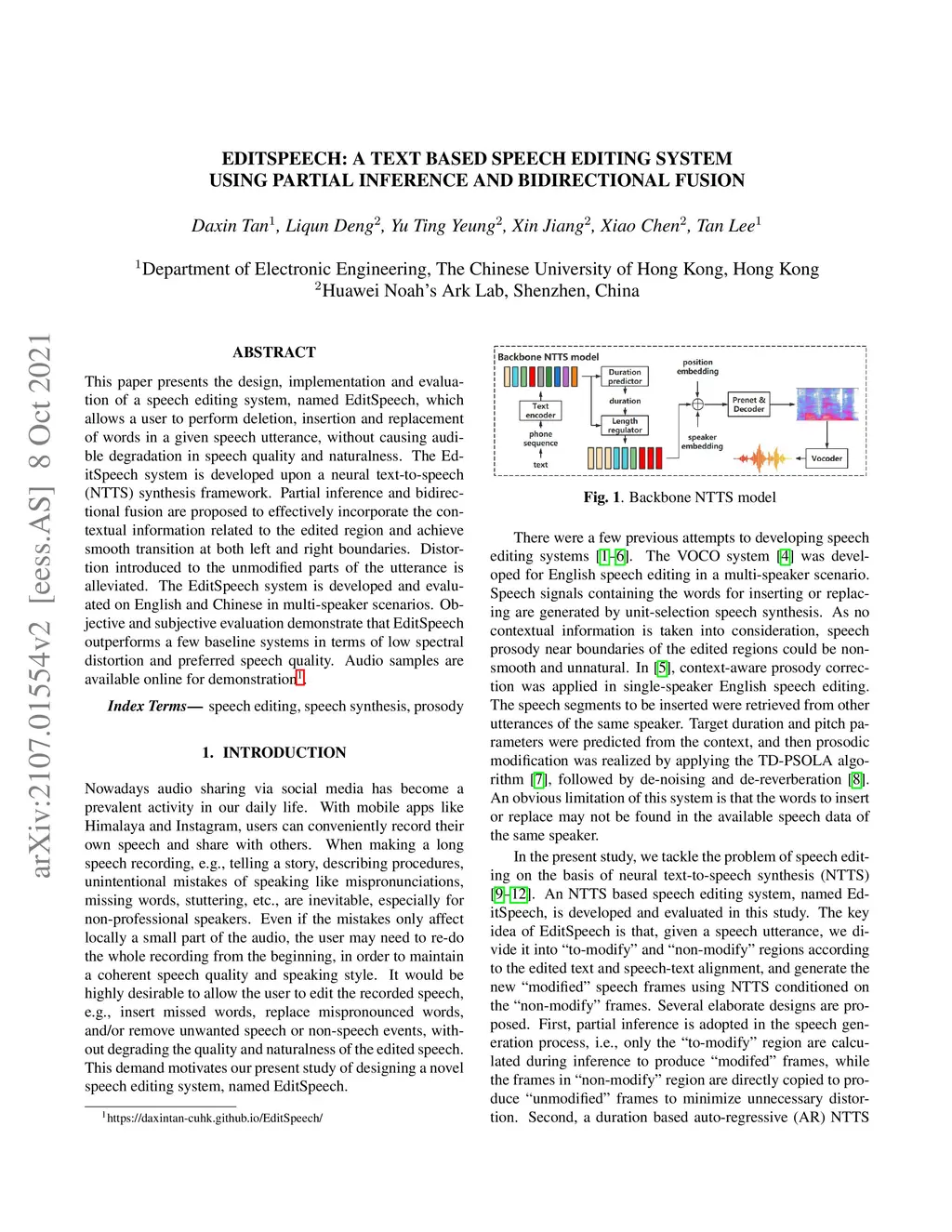 This paper presents the design, implementation and evaluation of a speech editing system, named EditSpeech, which allows a user to perform deletion, insertion and replacement of words in a given speech utterance, without causing audible degradation in speech quality and naturalness. The EditSpeech system is developed upon a neural text-to-speech (NTTS) synthesis framework. Partial inference and bidirectional fusion are proposed to effectively incorporate the contextual information related to the edited region and achieve smooth transition at both left and right boundaries. Distortion introduced to the unmodified parts of the utterance is alleviated. The EditSpeech system is developed and evaluated on English and Chinese in multi-speaker scenarios. Objective and subjective evaluation demonstrate that EditSpeech outperforms a few baseline systems in terms of low spectral distortion and preferred speech quality. Audio samples are available online for demonstration https://daxintan-cuhk.github.io/EditSpeech/ .