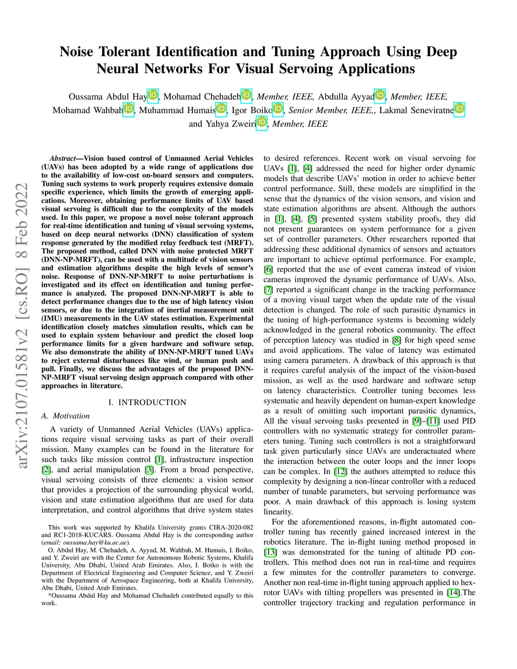 Vision based control of Unmanned Aerial Vehicles (UAVs) has been adopted by a wide range of applications due to the availability of low-cost on-board sensors and computers. Tuning such systems to work properly requires extensive domain specific experience, which limits the growth of emerging applications. Moreover, obtaining performance limits of UAV based visual servoing is difficult due to the complexity of the models used. In this paper, we propose a novel noise tolerant approach for real-time identification and tuning of visual servoing systems, based on deep neural networks (DNN) classification of system response generated by the modified relay feedback test (MRFT). The proposed method, called DNN with noise protected MRFT (DNN-NP-MRFT), can be used with a multitude of vision sensors and estimation algorithms despite the high levels of sensor's noise. Response of DNN-NP-MRFT to noise perturbations is investigated and its effect on identification and tuning performance is analyzed. The proposed DNN-NP-MRFT is able to detect performance changes due to the use of high latency vision sensors, or due to the integration of inertial measurement unit (IMU) measurements in the UAV states estimation. Experimental identification closely matches simulation results, which can be used to explain system behaviour and predict the closed loop performance limits for a given hardware and software setup. We also demonstrate the ability of DNN-NP-MRFT tuned UAVs to reject external disturbances like wind, or human push and pull. Finally, we discuss the advantages of the proposed DNN-NP-MRFT visual servoing design approach compared with other approaches in literature.