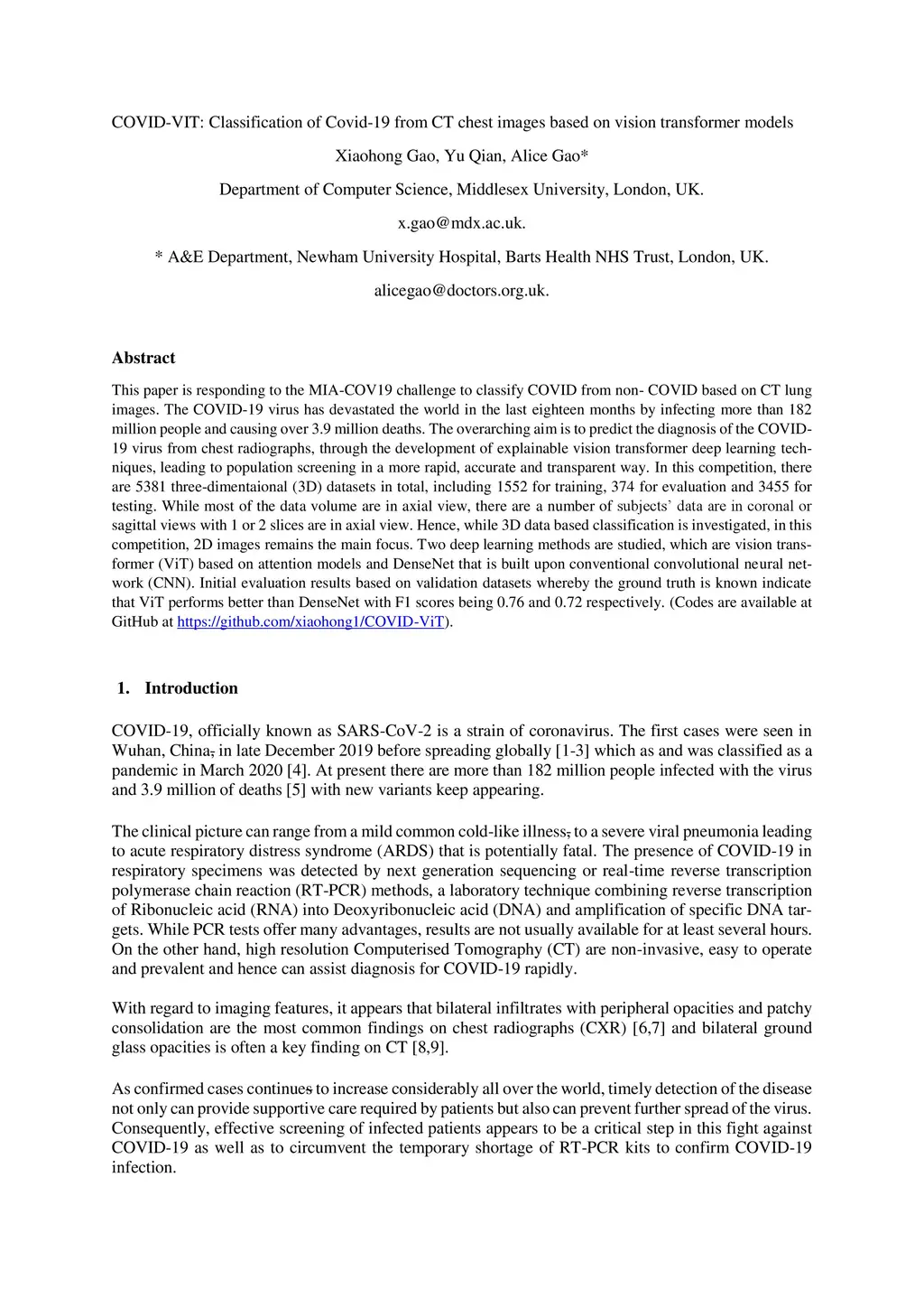 This paper is responding to the MIA-COV19 challenge to classify COVID from non-COVID based on CT lung images. The COVID-19 virus has devastated the world in the last eighteen months by infecting more than 182 million people and causing over 3.9 million deaths. The overarching aim is to predict the diagnosis of the COVID-19 virus from chest radiographs, through the development of explainable vision transformer deep learning techniques, leading to population screening in a more rapid, accurate and transparent way. In this competition, there are 5381 three-dimensional (3D) datasets in total, including 1552 for training, 374 for evaluation and 3455 for testing. While most of the data volumes are in axial view, there are a number of subjects' data are in coronal or sagittal views with 1 or 2 slices are in axial view. Hence, while 3D data based classification is investigated, in this competition, 2D images remains the main focus. Two deep learning methods are studied, which are vision transformer (ViT) based on attention models and DenseNet that is built upon conventional convolutional neural network (CNN). Initial evaluation results based on validation datasets whereby the ground truth is known indicate that ViT performs better than DenseNet with F1 scores being 0.76 and 0.72 respectively. Codes are available at GitHub at <https://github/xiaohong1/COVID-ViT>.
