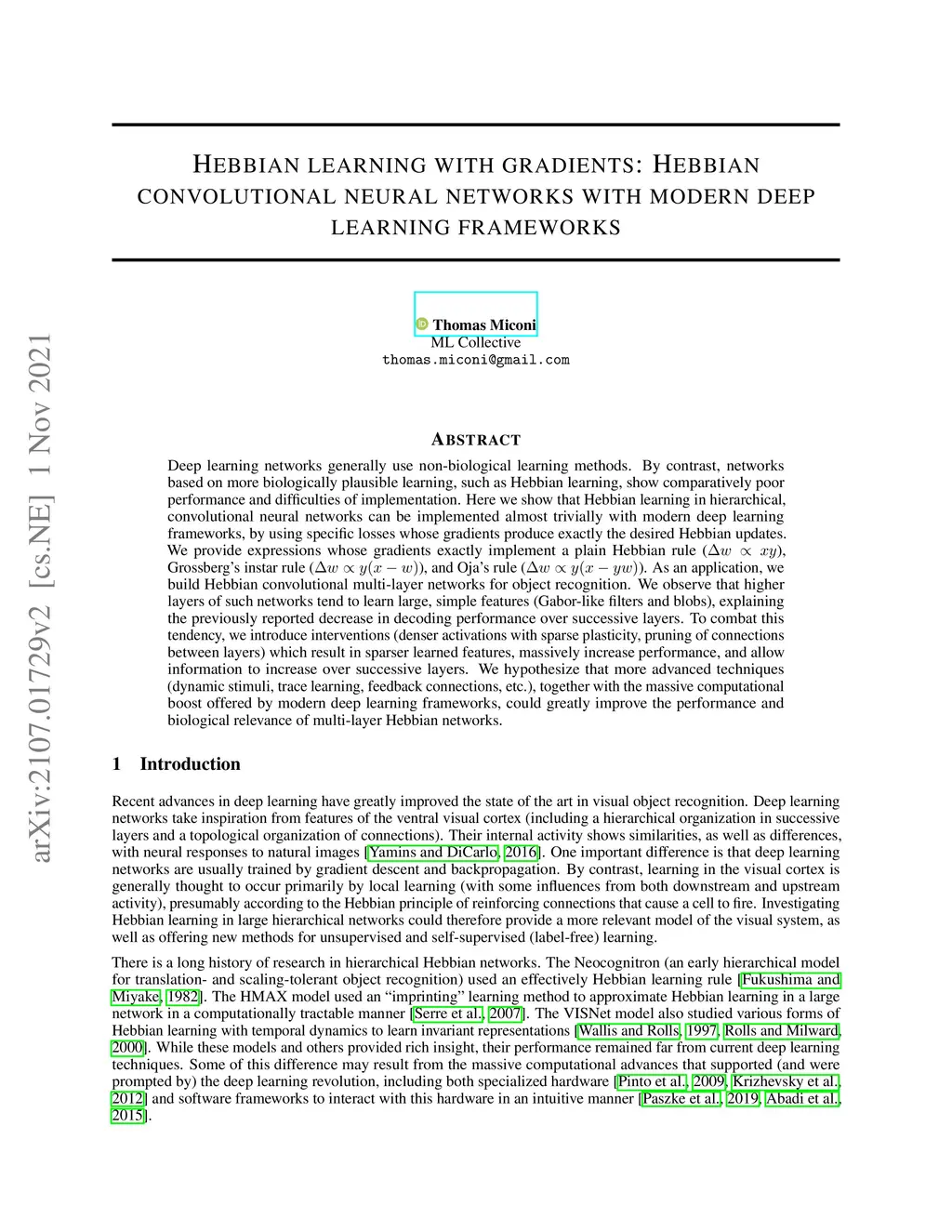 Deep learning networks generally use non-biological learning methods. By contrast, networks based on more biologically plausible learning, such as Hebbian learning, show comparatively poor performance and difficulties of implementation. Here we show that Hebbian learning in hierarchical, convolutional neural networks can be implemented almost trivially with modern deep learning frameworks, by using specific losses whose gradients produce exactly the desired Hebbian updates. We provide expressions whose gradients exactly implement a plain Hebbian rule (dw ~= xy), Grossberg's instar rule (dw ~= y(x-w)), and Oja's rule (dw ~= y(x-yw)). As an application, we build Hebbian convolutional multi-layer networks for object recognition. We observe that higher layers of such networks tend to learn large, simple features (Gabor-like filters and blobs), explaining the previously reported decrease in decoding performance over successive layers. To combat this tendency, we introduce interventions (denser activations with sparse plasticity, pruning of connections between layers) which result in sparser learned features, massively increase performance, and allow information to increase over successive layers. We hypothesize that more advanced techniques (dynamic stimuli, trace learning, feedback connections, etc.), together with the massive computational boost offered by modern deep learning frameworks, could greatly improve the performance and biological relevance of multi-layer Hebbian networks.