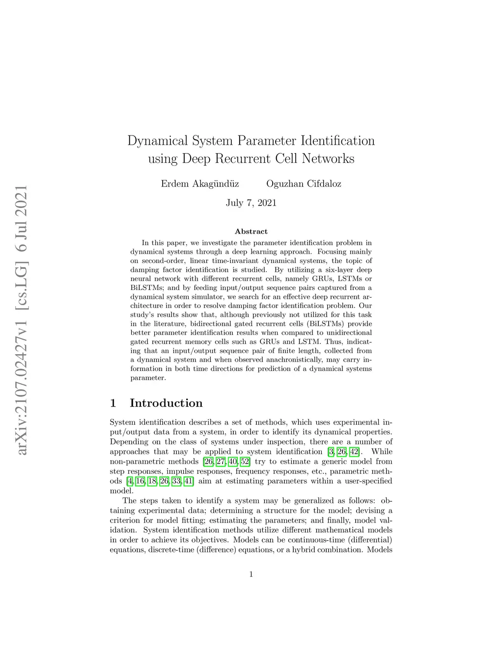 In this paper, we investigate the parameter identification problem in dynamical systems through a deep learning approach. Focusing mainly on second-order, linear time-invariant dynamical systems, the topic of damping factor identification is studied. By utilizing a six-layer deep neural network with different recurrent cells, namely GRUs, LSTMs or BiLSTMs; and by feeding input-output sequence pairs captured from a dynamical system simulator, we search for an effective deep recurrent architecture in order to resolve damping factor identification problem. Our study results show that, although previously not utilized for this task in the literature, bidirectional gated recurrent cells (BiLSTMs) provide better parameter identification results when compared to unidirectional gated recurrent memory cells such as GRUs and LSTM. Thus, indicating that an input-output sequence pair of finite length, collected from a dynamical system and when observed anachronistically, may carry information in both time directions for prediction of a dynamical systems parameter.