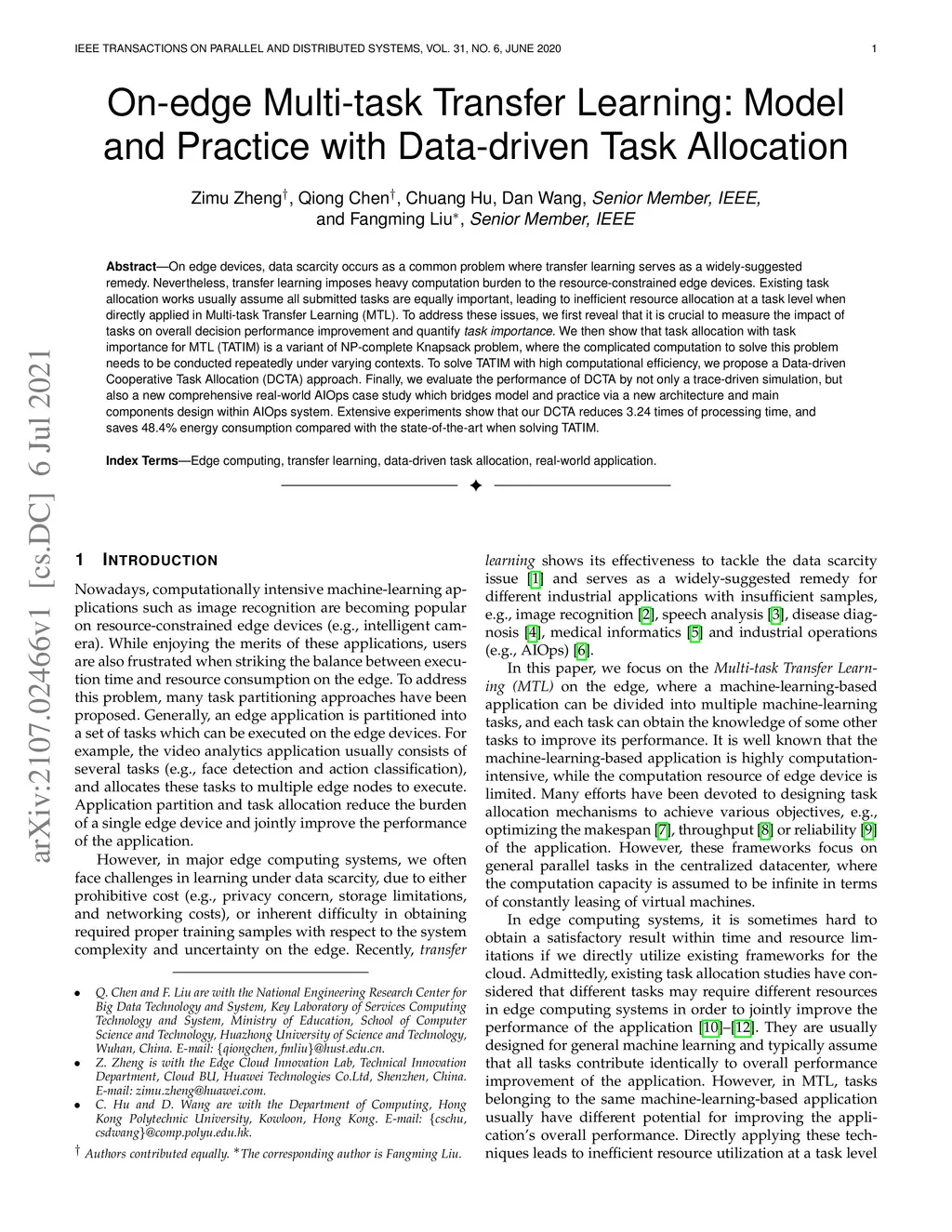 On edge devices, data scarcity occurs as a common problem where transfer learning serves as a widely-suggested remedy. Nevertheless, transfer learning imposes a heavy computation burden to resource-constrained edge devices. Existing task allocation works usually assume all submitted tasks are equally important, leading to inefficient resource allocation at a task level when directly applied in Multi-task Transfer Learning (MTL). To address these issues, we first reveal that it is crucial to measure the impact of tasks on overall decision performance improvement and quantify \emph{task importance}. We then show that task allocation with task importance for MTL (TATIM) is a variant of the NP-complete Knapsack problem, where the complicated computation to solve this problem needs to be conducted repeatedly under varying contexts. To solve TATIM with high computational efficiency, we propose a Data-driven Cooperative Task Allocation (DCTA) approach. Finally, we evaluate the performance of DCTA by not only a trace-driven simulation, but also a new comprehensive real-world AIOps case study that bridges model and practice via a new architecture and main components design within the AIOps system. Extensive experiments show that our DCTA reduces 3.24 times of processing time, and saves 48.4\% energy consumption compared with the state-of-the-art when solving TATIM.