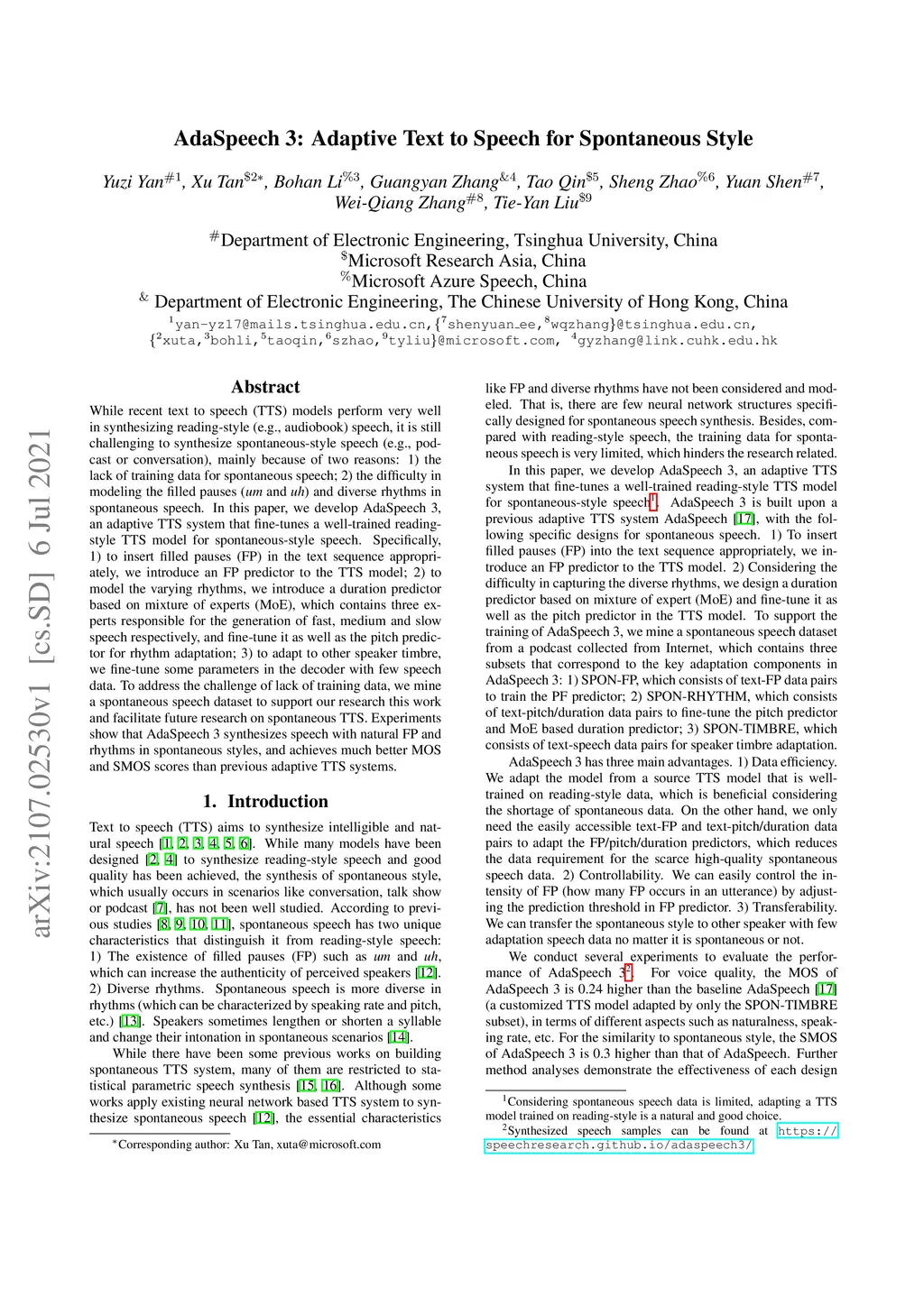 While recent text to speech (TTS) models perform very well in synthesizing reading-style (e.g., audiobook) speech, it is still challenging to synthesize spontaneous-style speech (e.g., podcast or conversation), mainly because of two reasons: 1) the lack of training data for spontaneous speech; 2) the difficulty in modeling the filled pauses (um and uh) and diverse rhythms in spontaneous speech. In this paper, we develop AdaSpeech 3, an adaptive TTS system that fine-tunes a well-trained reading-style TTS model for spontaneous-style speech. Specifically, 1) to insert filled pauses (FP) in the text sequence appropriately, we introduce an FP predictor to the TTS model; 2) to model the varying rhythms, we introduce a duration predictor based on mixture of experts (MoE), which contains three experts responsible for the generation of fast, medium and slow speech respectively, and fine-tune it as well as the pitch predictor for rhythm adaptation; 3) to adapt to other speaker timbre, we fine-tune some parameters in the decoder with few speech data. To address the challenge of lack of training data, we mine a spontaneous speech dataset to support our research this work and facilitate future research on spontaneous TTS. Experiments show that AdaSpeech 3 synthesizes speech with natural FP and rhythms in spontaneous styles, and achieves much better MOS and SMOS scores than previous adaptive TTS systems.