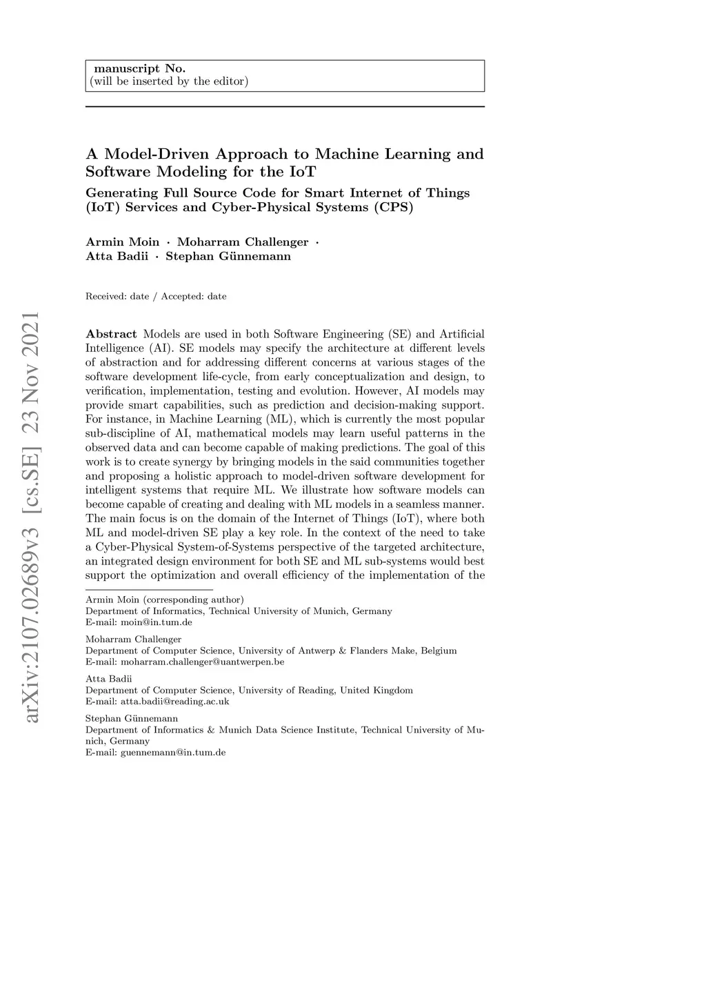 A Model-Driven Approach to Machine Learning and Software Modeling for