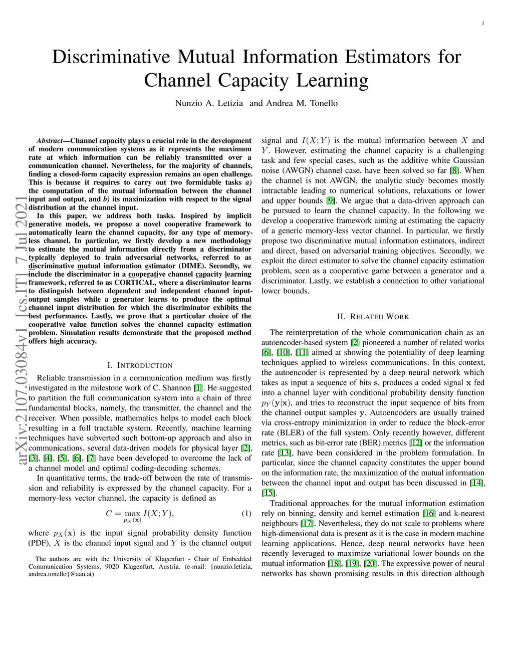 Channel capacity plays a crucial role in the development of modern communication systems as it represents the maximum rate at which information can be reliably transmitted over a communication channel. Nevertheless, for the majority of channels, finding a closed-form capacity expression remains an open challenge. This is because it requires to carry out two formidable tasks a) the computation of the mutual information between the channel input and output, and b) its maximization with respect to the signal distribution at the channel input. In this paper, we address both tasks. Inspired by implicit generative models, we propose a novel cooperative framework to automatically learn the channel capacity, for any type of memory-less channel. In particular, we firstly develop a new methodology to estimate the mutual information directly from a discriminator typically deployed to train adversarial networks, referred to as discriminative mutual information estimator (DIME). Secondly, we include the discriminator in a cooperative channel capacity learning framework, referred to as CORTICAL, where a discriminator learns to distinguish between dependent and independent channel input-output samples while a generator learns to produce the optimal channel input distribution for which the discriminator exhibits the best performance. Lastly, we prove that a particular choice of the cooperative value function solves the channel capacity estimation problem. Simulation results demonstrate that the proposed method offers high accuracy.