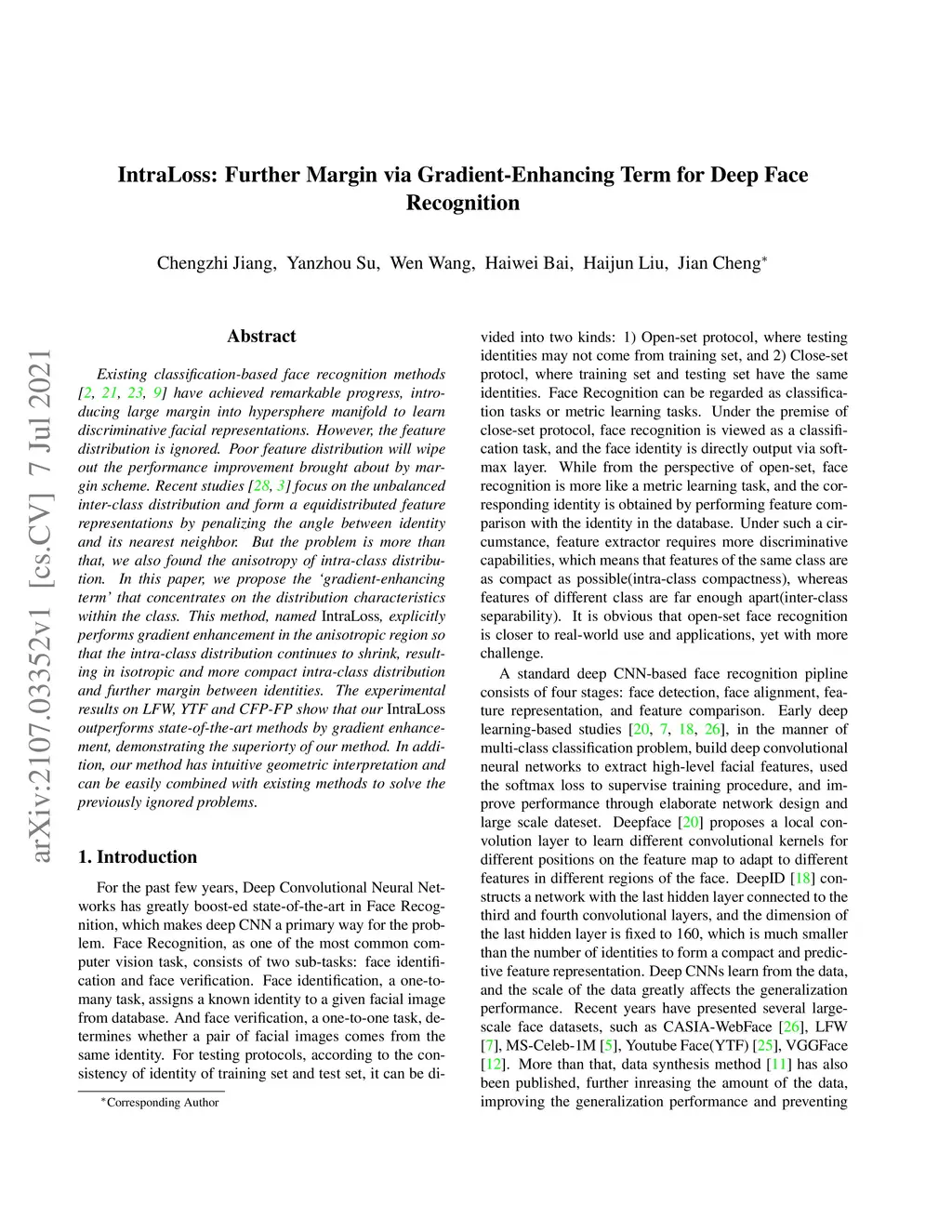 IntraLoss: Further Margin via Gradient-Enhancing Term for Deep Face
