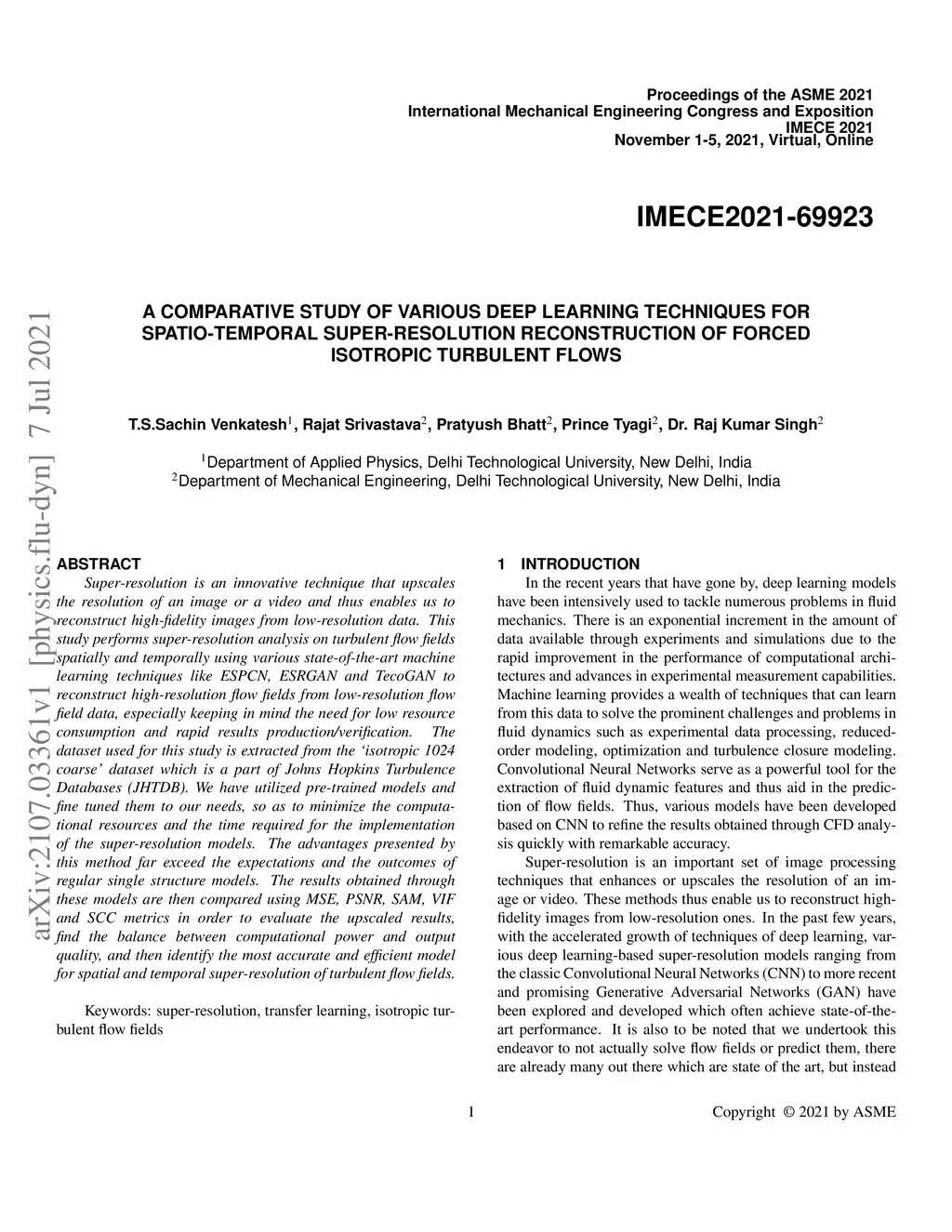 Super-resolution is an innovative technique that upscales the resolution of an image or a video and thus enables us to reconstruct high-fidelity images from low-resolution data. This study performs super-resolution analysis on turbulent flow fields spatially and temporally using various state-of-the-art machine learning techniques like ESPCN, ESRGAN and TecoGAN to reconstruct high-resolution flow fields from low-resolution flow field data, especially keeping in mind the need for low resource consumption and rapid results production/verification. The dataset used for this study is extracted from the ísotropic 1024 coarse' dataset which is a part of Johns Hopkins Turbulence Databases (JHTDB). We have utilized pre-trained models and fine tuned them to our needs, so as to minimize the computational resources and the time required for the implementation of the super-resolution models. The advantages presented by this method far exceed the expectations and the outcomes of regular single structure models. The results obtained through these models are then compared using MSE, PSNR, SAM, VIF and SCC metrics in order to evaluate the upscaled results, find the balance between computational power and output quality, and then identify the most accurate and efficient model for spatial and temporal super-resolution of turbulent flow fields.