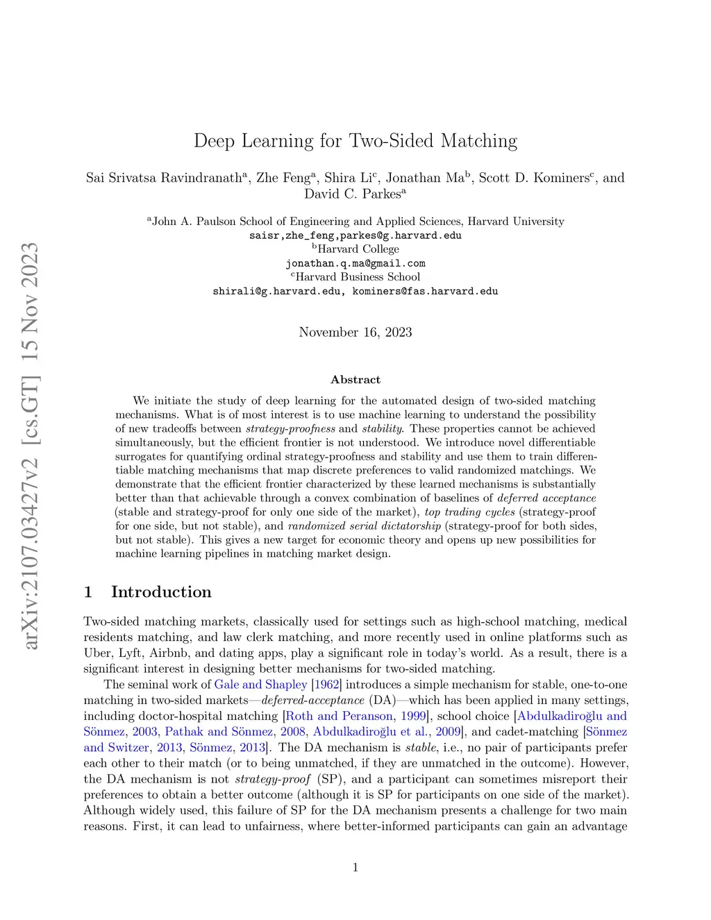 We initiate the study of deep learning for the automated design of two-sided matching mechanisms. What is of most interest is to use machine learning to understand the possibility of new tradeoffs between strategy-proofness and stability. These properties cannot be achieved simultaneously, but the efficient frontier is not understood. We introduce novel differentiable surrogates for quantifying ordinal strategy-proofness and stability and use them to train differentiable matching mechanisms that map discrete preferences to valid randomized matchings. We demonstrate that the efficient frontier characterized by these learned mechanisms is substantially better than that achievable through a convex combination of baselines of deferred acceptance (stable and strategy-proof for only one side of the market), top trading cycles (strategy-proof for one side, but not stable), and randomized serial dictatorship (strategy-proof for both sides, but not stable). This gives a new target for economic theory and opens up new possibilities for machine learning pipelines in matching market design.
