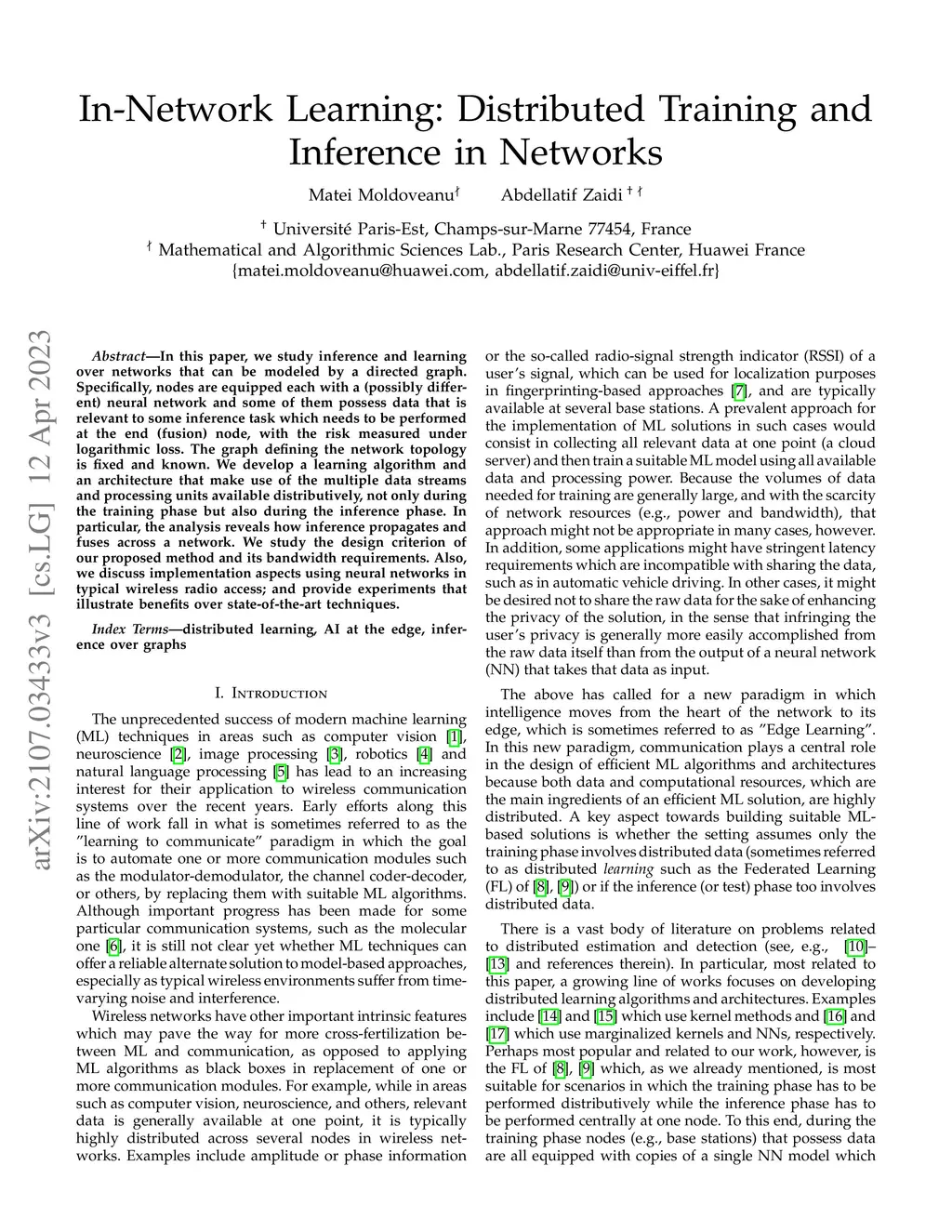 It is widely perceived that leveraging the success of modern machine learning techniques to mobile devices and wireless networks has the potential of enabling important new services. This, however, poses significant challenges, essentially due to that both data and processing power are highly distributed in a wireless network. In this paper, we develop a learning algorithm and an architecture that make use of multiple data streams and processing units, not only during the training phase but also during the inference phase. In particular, the analysis reveals how inference propagates and fuses across a network. We study the design criterion of our proposed method and its bandwidth requirements. Also, we discuss implementation aspects using neural networks in typical wireless radio access; and provide experiments that illustrate benefits over state-of-the-art techniques.