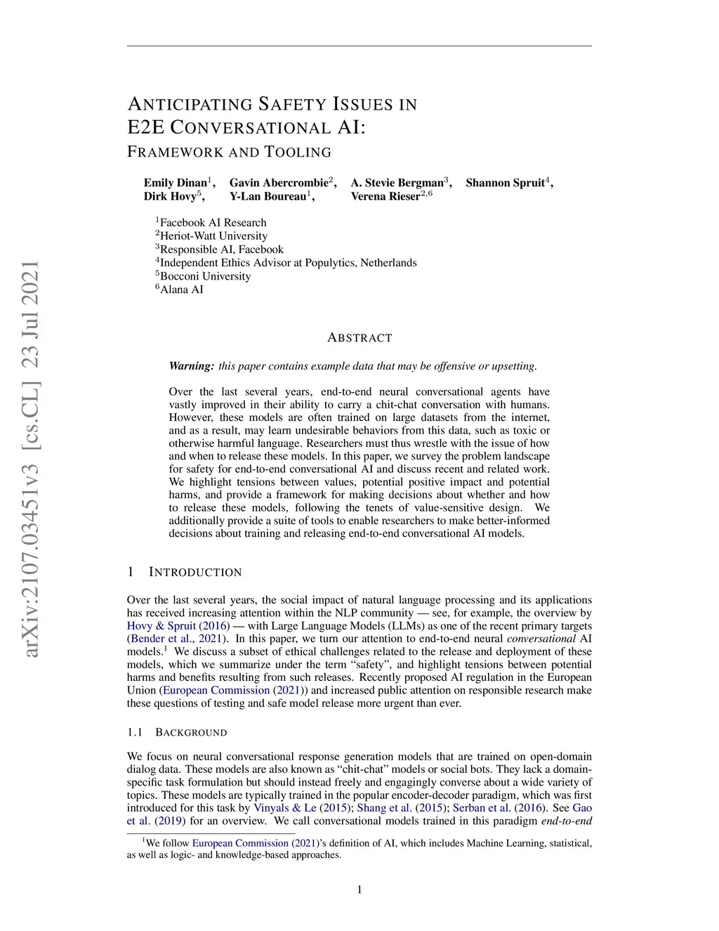 Anticipating Safety Issues in E2E Conversational AI: Framework and Tooling
