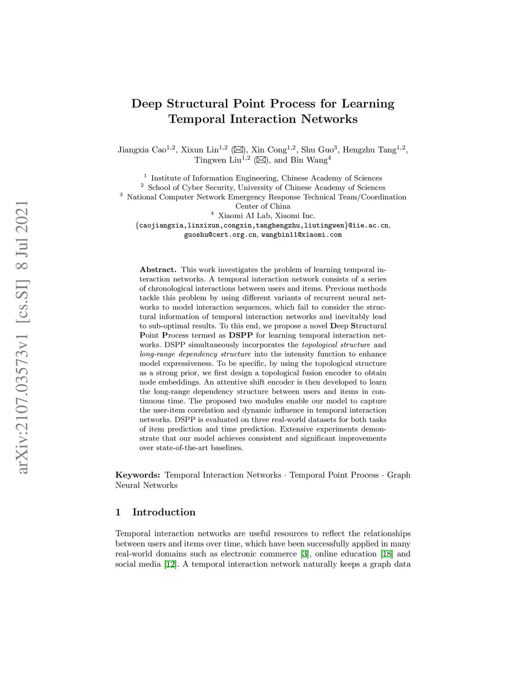 This work investigates the problem of learning temporal interaction networks. A temporal interaction network consists of a series of chronological interactions between users and items. Previous methods tackle this problem by using different variants of recurrent neural networks to model sequential interactions, which fail to consider the structural information of temporal interaction networks and inevitably lead to sub-optimal results. To this end, we propose a novel Deep Structural Point Process termed as DSPP for learning temporal interaction networks. DSPP simultaneously incorporates the topological structure and long-range dependency structure into our intensity function to enhance model expressiveness. To be specific, by using the topological structure as a strong prior, we first design a topological fusion encoder to obtain node embeddings. An attentive shift encoder is then developed to learn the long-range dependency structure between users and items in continuous time. The proposed two modules enable our model to capture the user-item correlation and dynamic influence in temporal interaction networks. DSPP is evaluated on three real-world datasets for both tasks of item prediction and time prediction. Extensive experiments demonstrate that our model achieves consistent and significant improvements over state-of-the-art baselines.