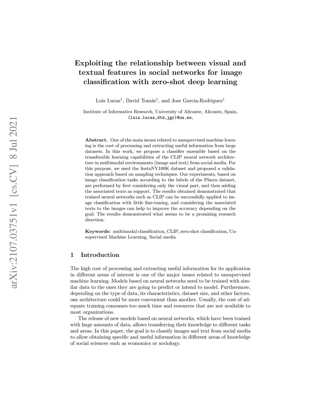 One of the main issues related to unsupervised machine learning is the cost of processing and extracting useful information from large datasets. In this work, we propose a classifier ensemble based on the transferable learning capabilities of the CLIP neural network architecture in multimodal environments (image and text) from social media. For this purpose, we used the InstaNY100K dataset and proposed a validation approach based on sampling techniques. Our experiments, based on image classification tasks according to the labels of the Places dataset, are performed by first considering only the visual part, and then adding the associated texts as support. The results obtained demonstrated that trained neural networks such as CLIP can be successfully applied to image classification with little fine-tuning, and considering the associated texts to the images can help to improve the accuracy depending on the goal. The results demonstrated what seems to be a promising research direction.