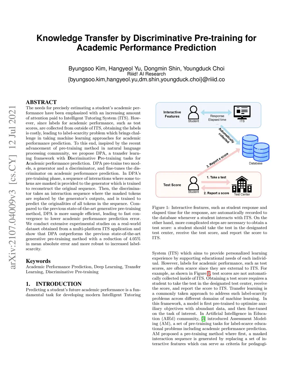 The needs for precisely estimating a student's academic performance have been emphasized with an increasing amount of attention paid to Intelligent Tutoring System (ITS). However, since labels for academic performance, such as test scores, are collected from outside of ITS, obtaining the labels is costly, leading to label-scarcity problem which brings challenge in taking machine learning approaches for academic performance prediction. To this end, inspired by the recent advancement of pre-training method in natural language processing community, we propose DPA, a transfer learning framework with Discriminative Pre-training tasks for Academic performance prediction. DPA pre-trains two models, a generator and a discriminator, and fine-tunes the discriminator on academic performance prediction. In DPA's pre-training phase, a sequence of interactions where some tokens are masked is provided to the generator which is trained to reconstruct the original sequence. Then, the discriminator takes an interaction sequence where the masked tokens are replaced by the generator's outputs, and is trained to predict the originalities of all tokens in the sequence. Compared to the previous state-of-the-art generative pre-training method, DPA is more sample efficient, leading to fast convergence to lower academic performance prediction error. We conduct extensive experimental studies on a real-world dataset obtained from a multi-platform ITS application and show that DPA outperforms the previous state-of-the-art generative pre-training method with a reduction of 4.05% in mean absolute error and more robust to increased label-scarcity.