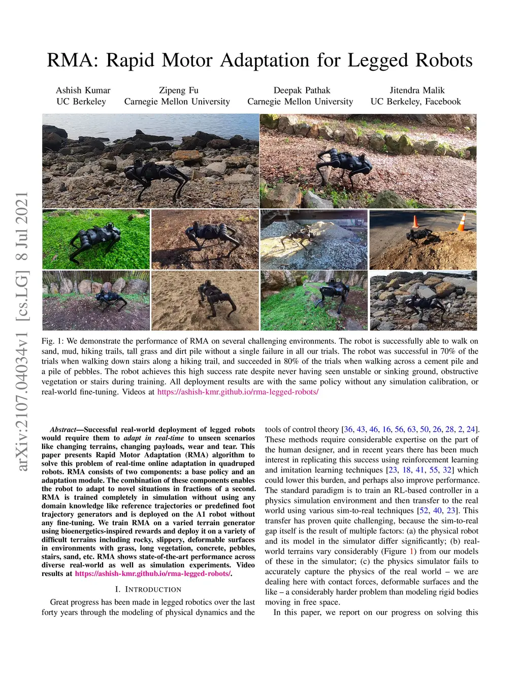 Successful real-world deployment of legged robots would require them to adapt in real-time to unseen scenarios like changing terrains, changing payloads, wear and tear. This paper presents Rapid Motor Adaptation (RMA) algorithm to solve this problem of real-time online adaptation in quadruped robots. RMA consists of two components: a base policy and an adaptation module. The combination of these components enables the robot to adapt to novel situations in fractions of a second. RMA is trained completely in simulation without using any domain knowledge like reference trajectories or predefined foot trajectory generators and is deployed on the A1 robot without any fine-tuning. We train RMA on a varied terrain generator using bioenergetics-inspired rewards and deploy it on a variety of difficult terrains including rocky, slippery, deformable surfaces in environments with grass, long vegetation, concrete, pebbles, stairs, sand, etc. RMA shows state-of-the-art performance across diverse real-world as well as simulation experiments. Video results at https://ashish-kmr.github.io/rma-legged-robots/