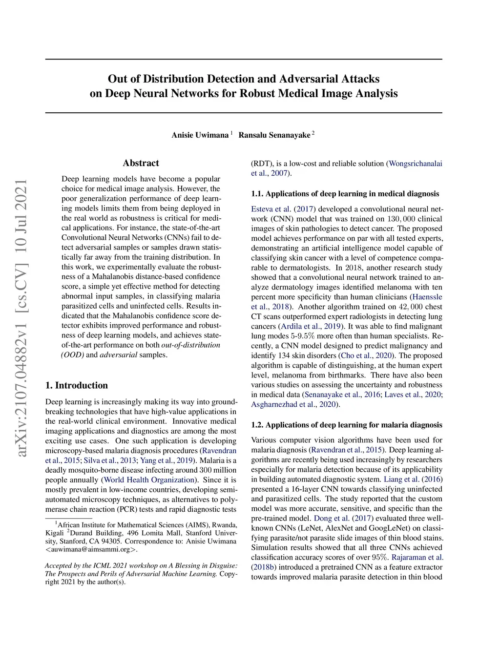 Deep learning models have become a popular choice for medical image analysis. However, the poor generalization performance of deep learning models limits them from being deployed in the real world as robustness is critical for medical applications. For instance, the state-of-the-art Convolutional Neural Networks (CNNs) fail to detect adversarial samples or samples drawn statistically far away from the training distribution. In this work, we experimentally evaluate the robustness of a Mahalanobis distance-based confidence score, a simple yet effective method for detecting abnormal input samples, in classifying malaria parasitized cells and uninfected cells. Results indicated that the Mahalanobis confidence score detector exhibits improved performance and robustness of deep learning models, and achieves stateof-the-art performance on both out-of-distribution (OOD) and adversarial samples.