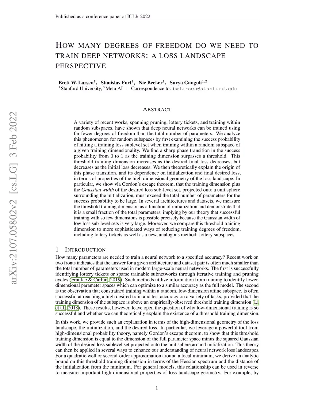A variety of recent works, spanning pruning, lottery tickets, and training within random subspaces, have shown that deep neural networks can be trained using far fewer degrees of freedom than the total number of parameters. We analyze this phenomenon for random subspaces by first examining the success probability of hitting a training loss sub-level set when training within a random subspace of a given training dimensionality. We find a sharp phase transition in the success probability from to as the training dimension surpasses a threshold. This threshold training dimension increases as the desired final loss decreases, but decreases as the initial loss decreases. We then theoretically explain the origin of this phase transition, and its dependence on initialization and final desired loss, in terms of properties of the high-dimensional geometry of the loss landscape. In particular, we show via Gordon's escape theorem, that the training dimension plus the Gaussian width of the desired loss sub-level set, projected onto a unit sphere surrounding the initialization, must exceed the total number of parameters for the success probability to be large. In several architectures and datasets, we measure the threshold training dimension as a function of initialization and demonstrate that it is a small fraction of the total parameters, implying by our theory that successful training with so few dimensions is possible precisely because the Gaussian width of low loss sub-level sets is very large. Moreover, we compare this threshold training dimension to more sophisticated ways of reducing training degrees of freedom, including lottery tickets as well as a new, analogous method: lottery subspaces. Code is available at https://github.com/ganguli-lab/degrees-of-freedom.