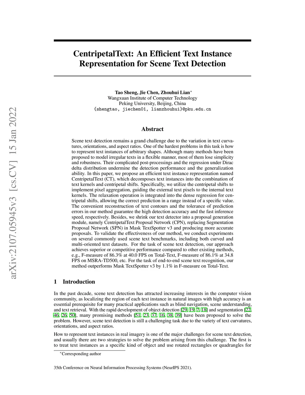 Scene text detection remains a grand challenge due to the variation in text curvatures, orientations, and aspect ratios. One of the hardest problems in this task is how to represent text instances of arbitrary shapes. Although many methods have been proposed to model irregular texts in a flexible manner, most of them lose simplicity and robustness. Their complicated post-processings and the regression under Dirac delta distribution undermine the detection performance and the generalization ability. In this paper, we propose an efficient text instance representation named CentripetalText (CT), which decomposes text instances into the combination of text kernels and centripetal shifts. Specifically, we utilize the centripetal shifts to implement pixel aggregation, guiding the external text pixels to the internal text kernels. The relaxation operation is integrated into the dense regression for centripetal shifts, allowing the correct prediction in a range instead of a specific value. The convenient reconstruction of text contours and the tolerance of prediction errors in our method guarantee the high detection accuracy and the fast inference speed, respectively. Besides, we shrink our text detector into a proposal generation module, namely CentripetalText Proposal Network, replacing Segmentation Proposal Network in Mask TextSpotter v3 and producing more accurate proposals. To validate the effectiveness of our method, we conduct experiments on several commonly used scene text benchmarks, including both curved and multi-oriented text datasets. For the task of scene text detection, our approach achieves superior or competitive performance compared to other existing methods, e.g., F-measure of 86.3% at 40.0 FPS on Total-Text, F-measure of 86.1% at 34.8 FPS on MSRA-TD500, etc. For the task of end-to-end scene text recognition, our method outperforms Mask TextSpotter v3 by 1.1% on Total-Text.