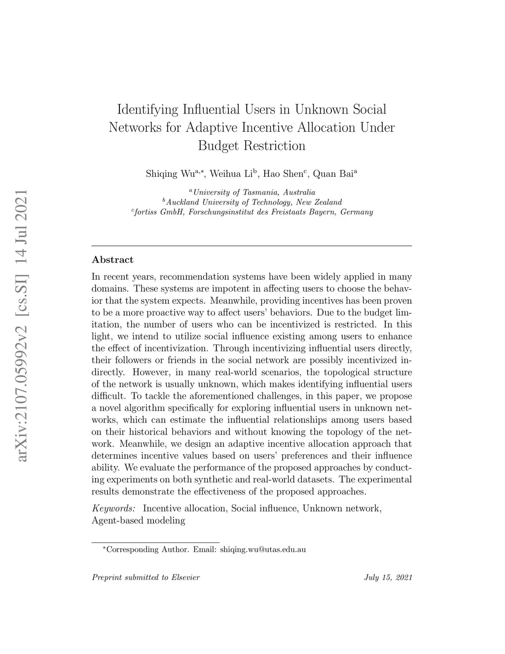 In recent years, recommendation systems have been widely applied in many domains. These systems are impotent in affecting users to choose the behavior that the system expects. Meanwhile, providing incentives has been proven to be a more proactive way to affect users' behaviors. Due to the budget limitation, the number of users who can be incentivized is restricted. In this light, we intend to utilize social influence existing among users to enhance the effect of incentivization. Through incentivizing influential users directly, their followers in the social network are possibly incentivized indirectly. However, in many real-world scenarios, the topological structure of the network is usually unknown, which makes identifying influential users difficult. To tackle the aforementioned challenges, in this paper, we propose a novel algorithm for exploring influential users in unknown networks, which can estimate the influential relationships among users based on their historical behaviors and without knowing the topology of the network. Meanwhile, we design an adaptive incentive allocation approach that determines incentive values based on users' preferences and their influence ability. We evaluate the performance of the proposed approaches by conducting experiments on both synthetic and real-world datasets. The experimental results demonstrate the effectiveness of the proposed approaches.