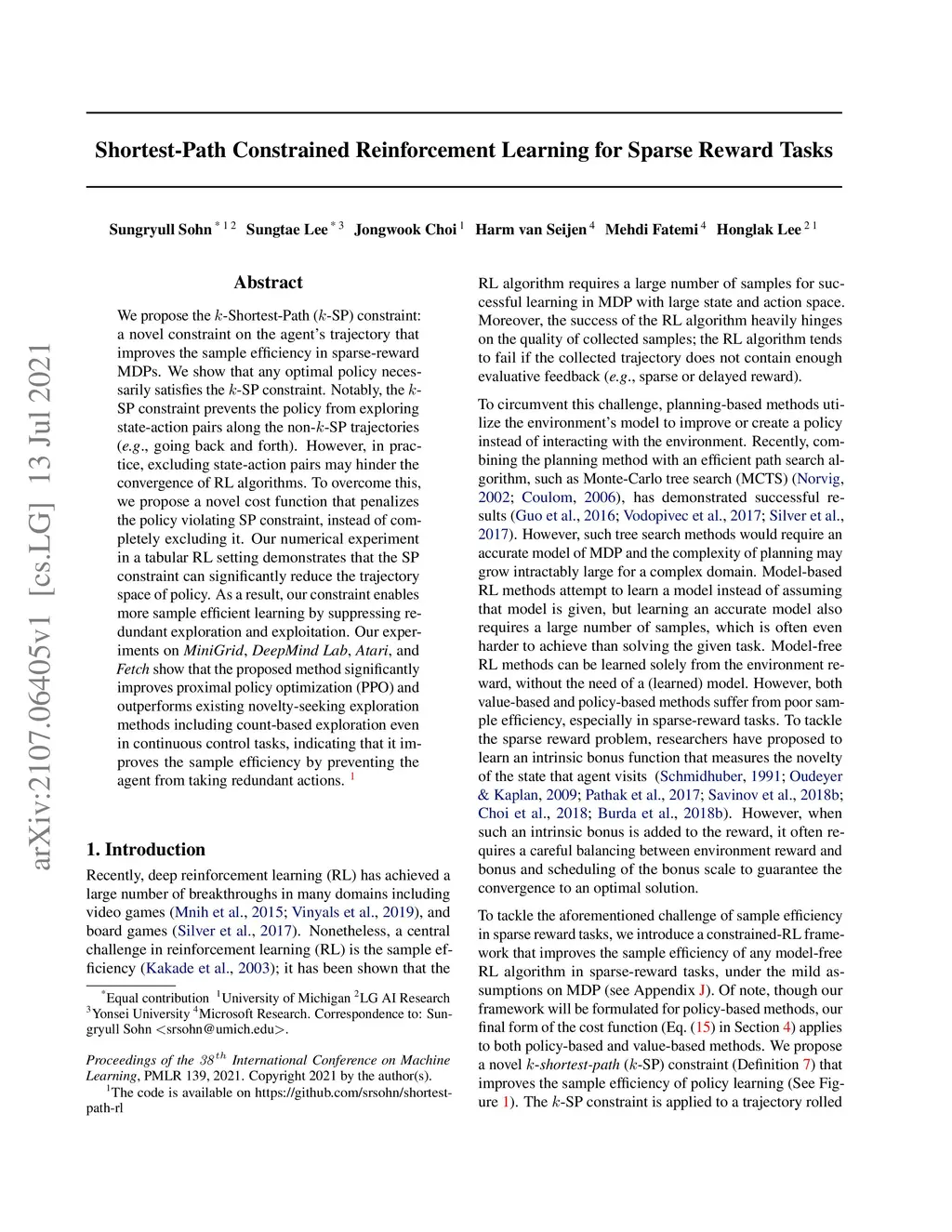Shortest-Path Constrained Reinforcement Learning for Sparse Reward Tasks
