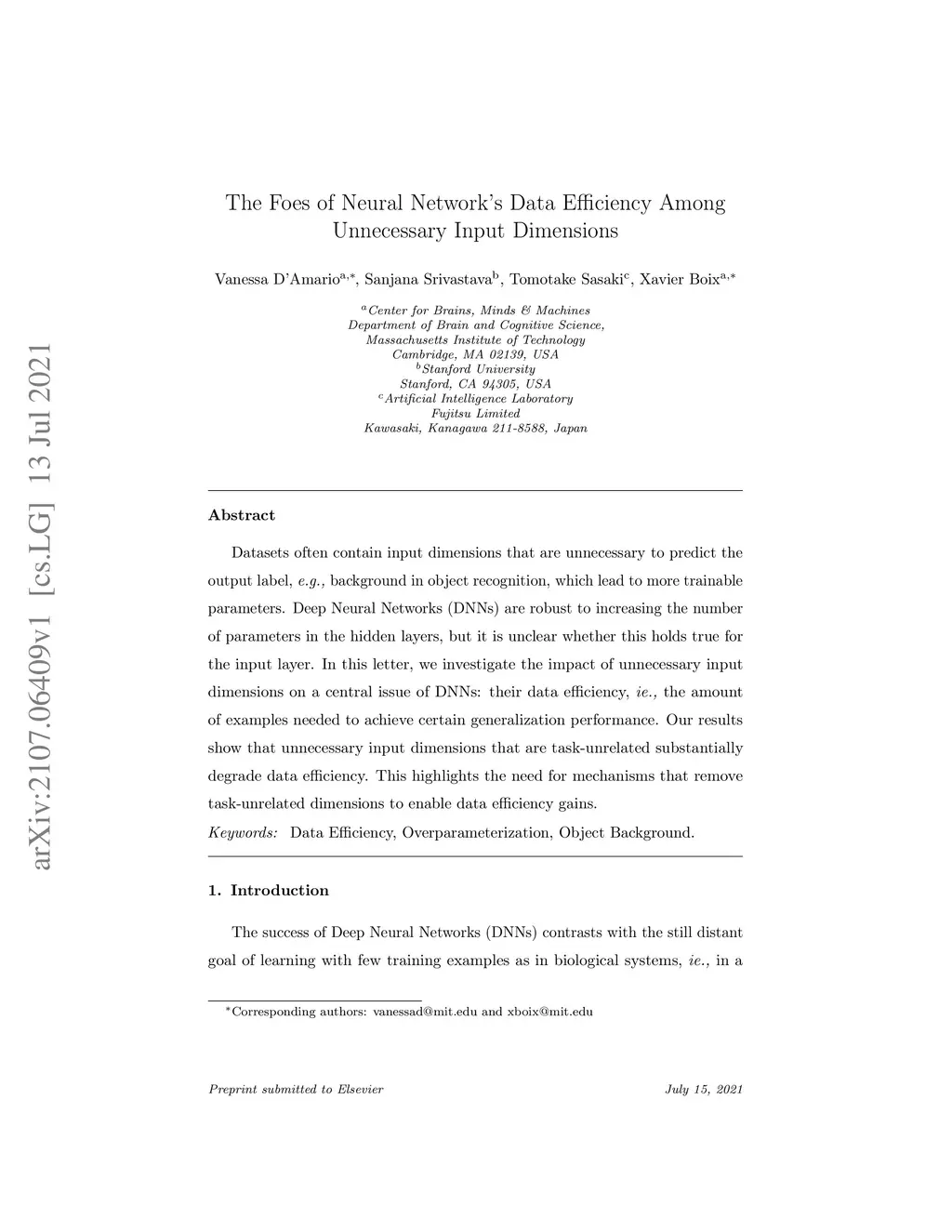 Datasets often contain input dimensions that are unnecessary to predict the output label, e.g. background in object recognition, which lead to more trainable parameters. Deep Neural Networks (DNNs) are robust to increasing the number of parameters in the hidden layers, but it is unclear whether this holds true for the input layer. In this letter, we investigate the impact of unnecessary input dimensions on a central issue of DNNs: their data efficiency, ie. the amount of examples needed to achieve certain generalization performance. Our results show that unnecessary input dimensions that are task-unrelated substantially degrade data efficiency. This highlights the need for mechanisms that remove {task-unrelated} dimensions to enable data efficiency gains.