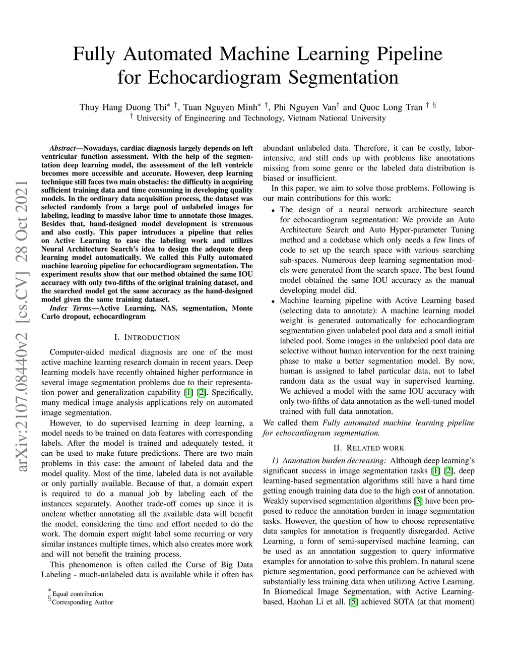 Nowadays, cardiac diagnosis largely depends on left ventricular function assessment. With the help of the segmentation deep learning model, the assessment of the left ventricle becomes more accessible and accurate. However, deep learning technique still faces two main obstacles: the difficulty in acquiring sufficient training data and time-consuming in developing quality models. In the ordinary data acquisition process, the dataset was selected randomly from a large pool of unlabeled images for labeling, leading to massive labor time to annotate those images. Besides that, hand-designed model development is strenuous and also costly. This paper introduces a pipeline that relies on Active Learning to ease the labeling work and utilizes Neural Architecture Search's idea to design the adequate deep learning model automatically. We called this Fully automated machine learning pipeline for echocardiogram segmentation. The experiment results show that our method obtained the same IOU accuracy with only two-fifths of the original training dataset, and the searched model got the same accuracy as the hand-designed model given the same training dataset.