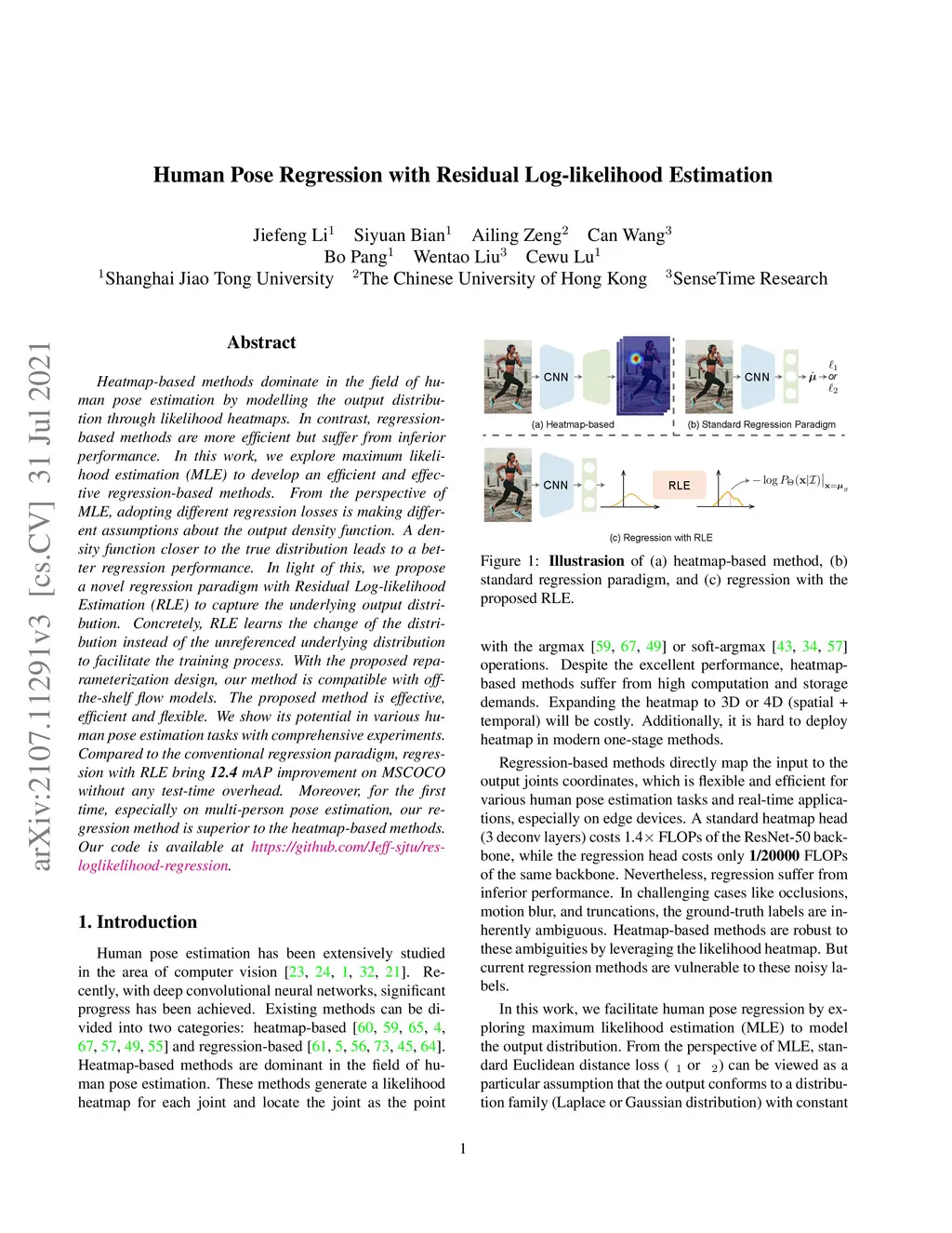 Heatmap-based methods dominate in the field of human pose estimation by modelling the output distribution through likelihood heatmaps. In contrast, regression-based methods are more efficient but suffer from inferior performance. In this work, we explore maximum likelihood estimation (MLE) to develop an efficient and effective regression-based methods. From the perspective of MLE, adopting different regression losses is making different assumptions about the output density function. A density function closer to the true distribution leads to a better regression performance. In light of this, we propose a novel regression paradigm with Residual Log-likelihood Estimation (RLE) to capture the underlying output distribution. Concretely, RLE learns the change of the distribution instead of the unreferenced underlying distribution to facilitate the training process. With the proposed reparameterization design, our method is compatible with off-the-shelf flow models. The proposed method is effective, efficient and flexible. We show its potential in various human pose estimation tasks with comprehensive experiments. Compared to the conventional regression paradigm, regression with RLE bring 12.4 mAP improvement on MSCOCO without any test-time overhead. Moreover, for the first time, especially on multi-person pose estimation, our regression method is superior to the heatmap-based methods. Our code is available at https://github.com/Jeff-sjtu/res-loglikelihood-regression