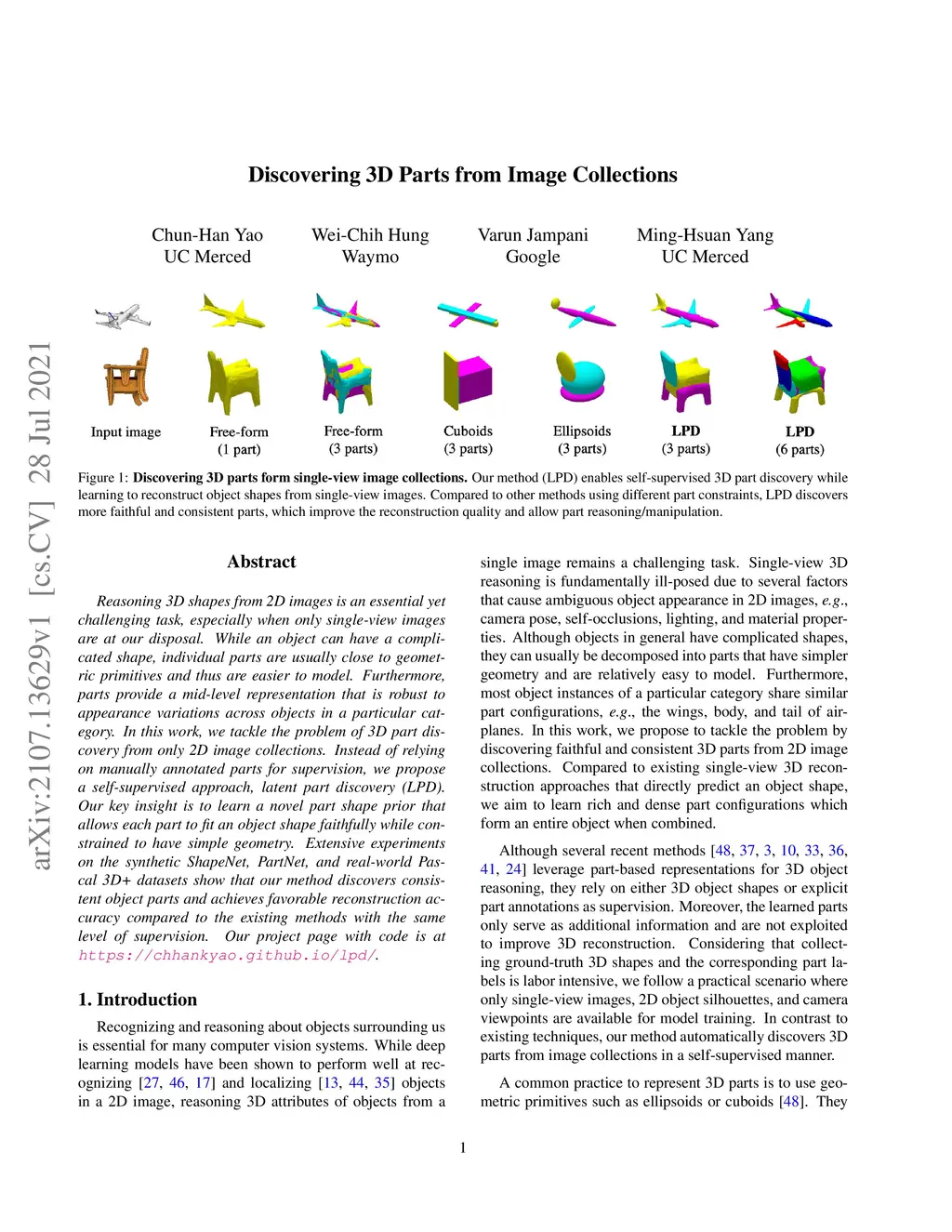 Reasoning 3D shapes from 2D images is an essential yet challenging task, especially when only single-view images are at our disposal. While an object can have a complicated shape, individual parts are usually close to geometric primitives and thus are easier to model. Furthermore, parts provide a mid-level representation that is robust to appearance variations across objects in a particular category. In this work, we tackle the problem of 3D part discovery from only 2D image collections. Instead of relying on manually annotated parts for supervision, we propose a self-supervised approach, latent part discovery (LPD). Our key insight is to learn a novel part shape prior that allows each part to fit an object shape faithfully while constrained to have simple geometry. Extensive experiments on the synthetic ShapeNet, PartNet, and real-world Pascal 3D+ datasets show that our method discovers consistent object parts and achieves favorable reconstruction accuracy compared to the existing methods with the same level of supervision.