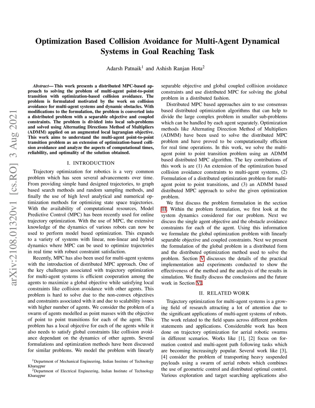 This work presents a distributed MPC-based approach to solving the problem of multi-agent point-to-point transition with optimization-based collision avoidance. The problem is formulated, motivated by the work on collision avoidance for multi-agent systems and dynamic obstacles. With modifications to the formulation, the problem is converted into a distributed problem with a separable objective and coupled constraints. The problem is divided into local sub-problems and solved using Alternating Directions Method of Multipliers(ADMM) applied on an augmented local lagrangian objective.This work aims to understand the multi-agent point-to-point transition problem as an extension of optimization-based collision avoidance and analyze the aspects of computational times, reliability, and optimality of the solution obtained.