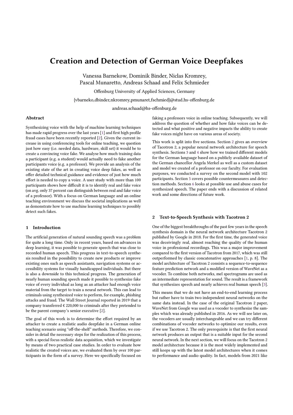 Synthesizing voice with the help of machine learning techniques has made rapid progress over the last years [1] and first high profile fraud cases have been recently reported [2]. Given the current increase in using conferencing tools for online teaching, we question just how easy (i.e. needed data, hardware, skill set) it would be to create a convincing voice fake. We analyse how much training data a participant (e.g. a student) would actually need to fake another participants voice (e.g. a professor). We provide an analysis of the existing state of the art in creating voice deep fakes, as well as offer detailed technical guidance and evidence of just how much effort is needed to copy a voice. A user study with more than 100 participants shows how difficult it is to identify real and fake voice (on avg. only 37 percent can distinguish between real and fake voice of a professor). With a focus on German language and an online teaching environment we discuss the societal implications as well as demonstrate how to use machine learning techniques to possibly detect such fakes.
