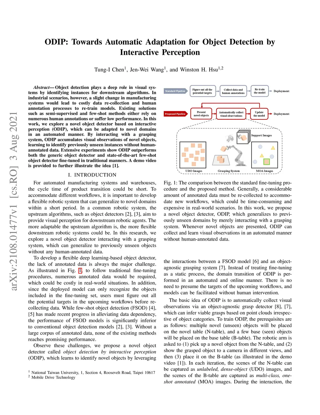 Object detection plays a deep role in visual systems by identifying instances for downstream algorithms. In industrial scenarios, however, a slight change in manufacturing systems would lead to costly data re-collection and human annotation processes to re-train models. Existing solutions such as semi-supervised and few-shot methods either rely on numerous human annotations or suffer low performance. In this work, we explore a novel object detector based on interactive perception (ODIP), which can be adapted to novel domains in an automated manner. By interacting with a grasping system, ODIP accumulates visual observations of novel objects, learning to identify previously unseen instances without human-annotated data. Extensive experiments show ODIP outperforms both the generic object detector and state-of-the-art few-shot object detector fine-tuned in traditional manners. A demo video is provided to further illustrate the idea.