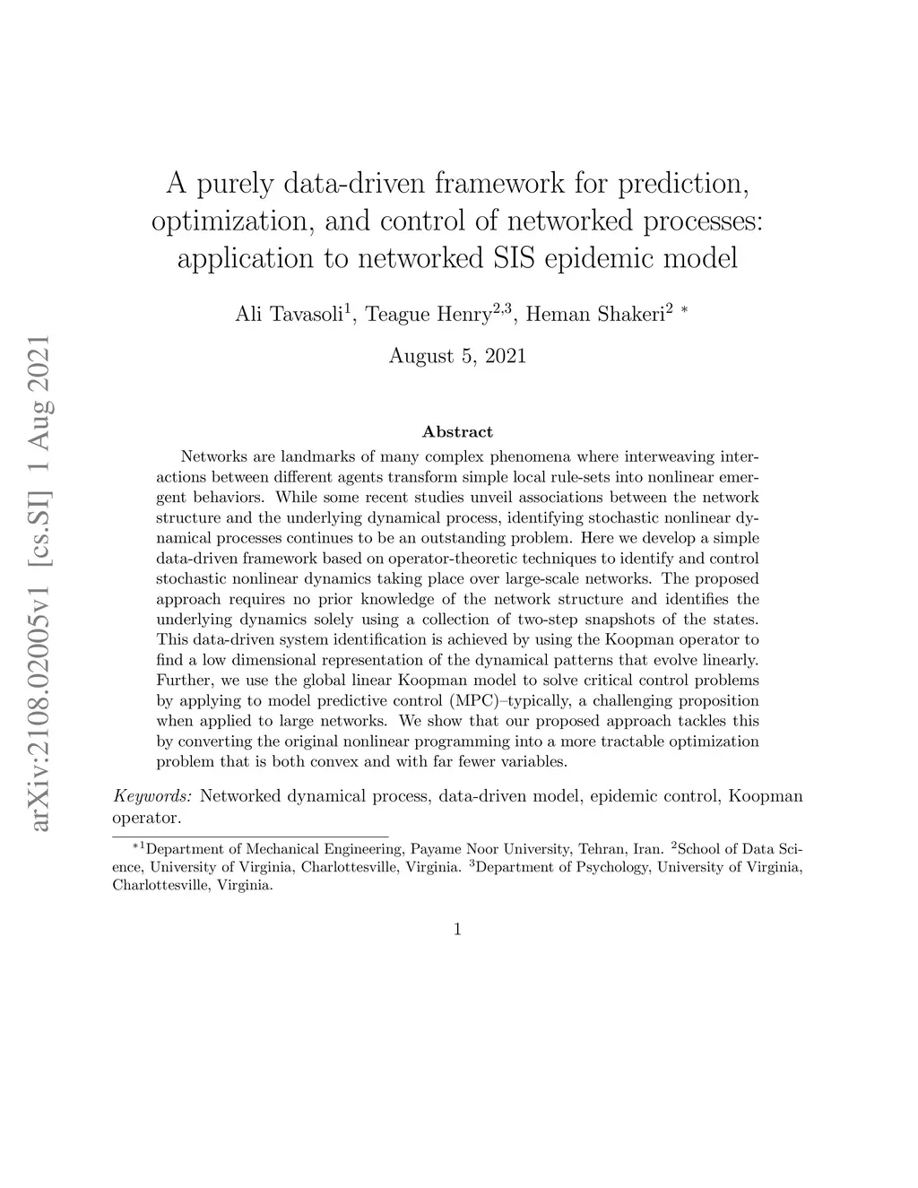 Networks are landmarks of many complex phenomena where interweaving interactions between different agents transform simple local rule-sets into nonlinear emergent behaviors. While some recent studies unveil associations between the network structure and the underlying dynamical process, identifying stochastic nonlinear dynamical processes continues to be an outstanding problem. Here we develop a simple data-driven framework based on operator-theoretic techniques to identify and control stochastic nonlinear dynamics taking place over large-scale networks. The proposed approach requires no prior knowledge of the network structure and identifies the underlying dynamics solely using a collection of two-step snapshots of the states. This data-driven system identification is achieved by using the Koopman operator to find a low dimensional representation of the dynamical patterns that evolve linearly. Further, we use the global linear Koopman model to solve critical control problems by applying to model predictive control (MPC)--typically, a challenging proposition when applied to large networks. We show that our proposed approach tackles this by converting the original nonlinear programming into a more tractable optimization problem that is both convex and with far fewer variables.