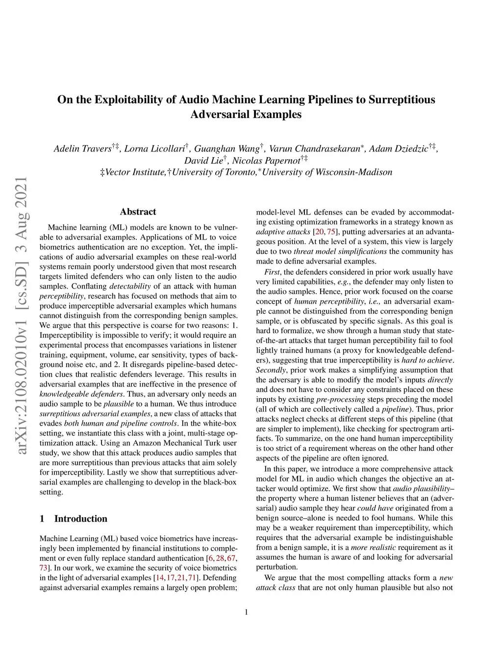 Machine learning (ML) models are known to be vulnerable to adversarial examples. Applications of ML to voice biometrics authentication are no exception. Yet, the implications of audio adversarial examples on these real-world systems remain poorly understood given that most research targets limited defenders who can only listen to the audio samples. Conflating detectability of an attack with human perceptibility, research has focused on methods that aim to produce imperceptible adversarial examples which humans cannot distinguish from the corresponding benign samples. We argue that this perspective is coarse for two reasons: 1. Imperceptibility is impossible to verify; it would require an experimental process that encompasses variations in listener training, equipment, volume, ear sensitivity, types of background noise etc, and 2. It disregards pipeline-based detection clues that realistic defenders leverage. This results in adversarial examples that are ineffective in the presence of knowledgeable defenders. Thus, an adversary only needs an audio sample to be plausible to a human. We thus introduce surreptitious adversarial examples, a new class of attacks that evades both human and pipeline controls. In the white-box setting, we instantiate this class with a joint, multi-stage optimization attack. Using an Amazon Mechanical Turk user study, we show that this attack produces audio samples that are more surreptitious than previous attacks that aim solely for imperceptibility. Lastly we show that surreptitious adversarial examples are challenging to develop in the black-box setting.