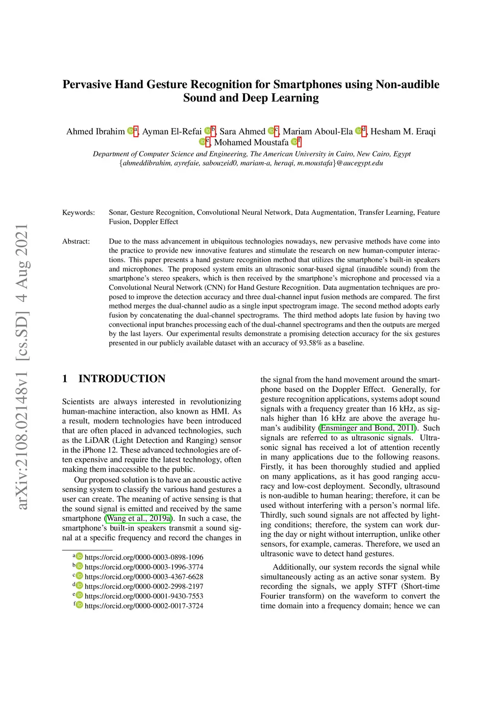 Due to the mass advancement in ubiquitous technologies nowadays, new pervasive methods have come into the practice to provide new innovative features and stimulate the research on new human-computer interactions. This paper presents a hand gesture recognition method that utilizes the smartphone's built-in speakers and microphones. The proposed system emits an ultrasonic sonar-based signal (inaudible sound) from the smartphone's stereo speakers, which is then received by the smartphone's microphone and processed via a Convolutional Neural Network (CNN) for Hand Gesture Recognition. Data augmentation techniques are proposed to improve the detection accuracy and three dual-channel input fusion methods are compared. The first method merges the dual-channel audio as a single input spectrogram image. The second method adopts early fusion by concatenating the dual-channel spectrograms. The third method adopts late fusion by having two convectional input branches processing each of the dual-channel spectrograms and then the outputs are merged by the last layers. Our experimental results demonstrate a promising detection accuracy for the six gestures presented in our publicly available dataset with an accuracy of 93.58\% as a baseline.