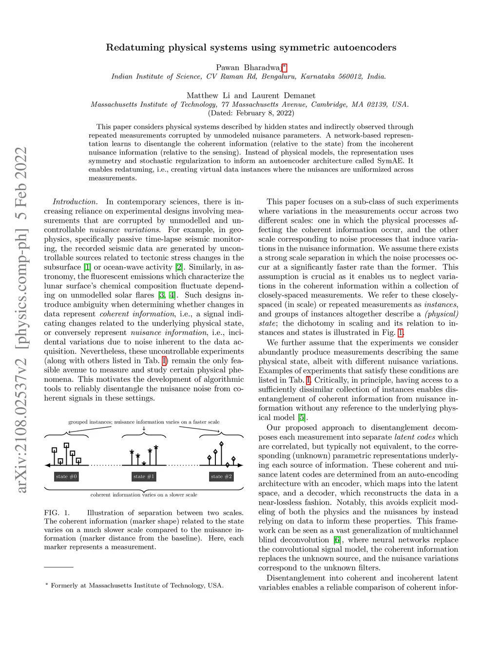 This paper considers physical systems described by hidden states and indirectly observed through repeated measurements corrupted by unmodeled nuisance parameters. A network-based representation learns to disentangle the coherent information (relative to the state) from the incoherent nuisance information (relative to the sensing). Instead of physical models, the representation uses symmetry and stochastic regularization to inform an autoencoder architecture called SymAE. It enables redatuming, i.e., creating virtual data instances where the nuisances are uniformized across measurements.