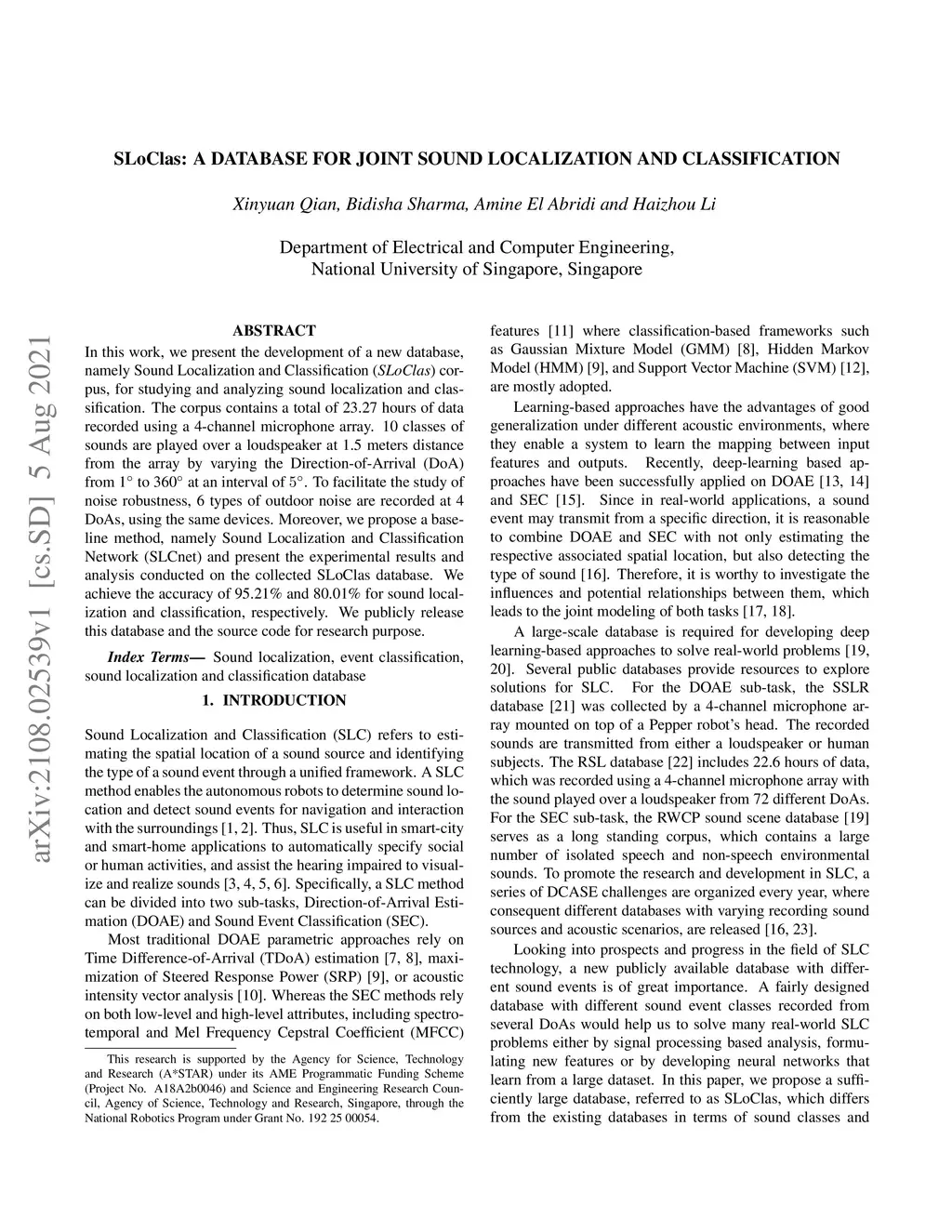 In this work, we present the development of a new database, namely Sound Localization and Classification (SLoClas) corpus, for studying and analyzing sound localization and classification. The corpus contains a total of 23.27 hours of data recorded using a 4-channel microphone array. 10 classes of sounds are played over a loudspeaker at 1.5 meters distance from the array by varying the Direction-of-Arrival (DoA) from 1 degree to 360 degree at an interval of 5 degree. To facilitate the study of noise robustness, 6 types of outdoor noise are recorded at 4 DoAs, using the same devices. Moreover, we propose a baseline method, namely Sound Localization and Classification Network (SLCnet) and present the experimental results and analysis conducted on the collected SLoClas database. We achieve the accuracy of 95.21% and 80.01% for sound localization and classification, respectively. We publicly release this database and the source code for research purpose.