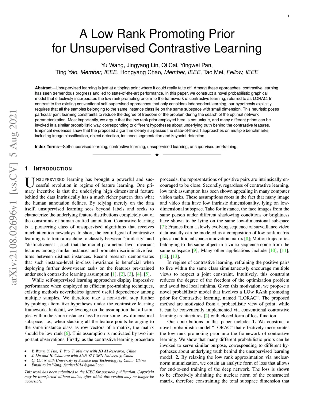 A Low Rank Promoting Prior for Unsupervised Contrastive Learning