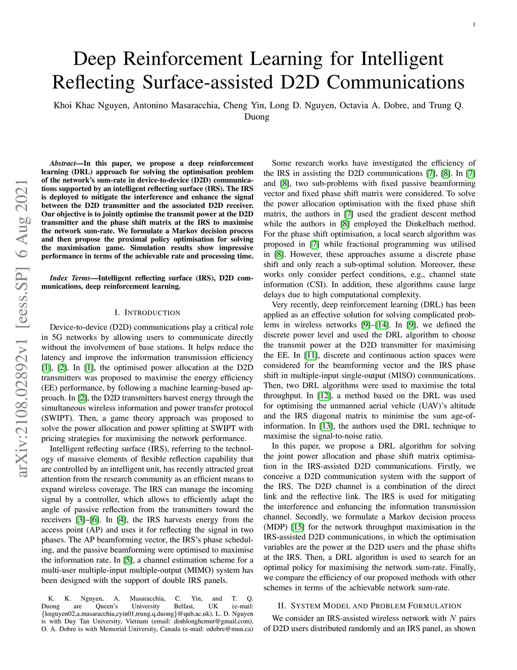 In this paper, we propose a deep reinforcement learning (DRL) approach for solving the optimisation problem of the network's sum-rate in device-to-device (D2D) communications supported by an intelligent reflecting surface (IRS). The IRS is deployed to mitigate the interference and enhance the signal between the D2D transmitter and the associated D2D receiver. Our objective is to jointly optimise the transmit power at the D2D transmitter and the phase shift matrix at the IRS to maximise the network sum-rate. We formulate a Markov decision process and then propose the proximal policy optimisation for solving the maximisation game. Simulation results show impressive performance in terms of the achievable rate and processing time.