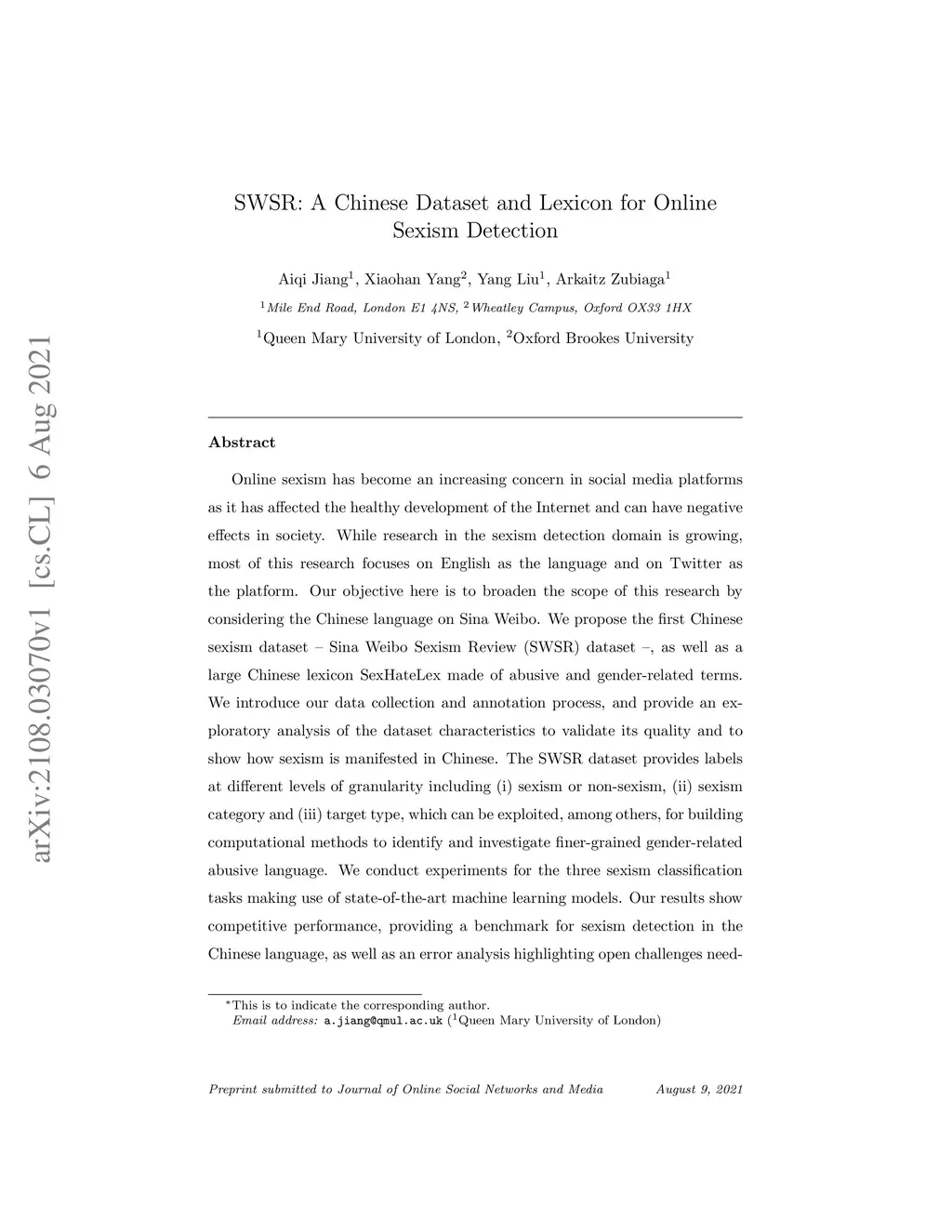 SWSR: A Chinese Dataset and Lexicon for Online Sexism Detection